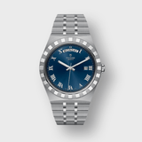 Measuring in at 41mm, the 100m water resistant stainless steel case features a crenelated bezel which is reminiscent of the engine turned bezels so beloved by Rolex in the 70’s. The dial is a stunning sunburst blue with Roman markers, as well as day and date complications. It’s powered by an ETA automatic movement known as a T603 in this application, making for an extremely versatile piece and extremely good value.