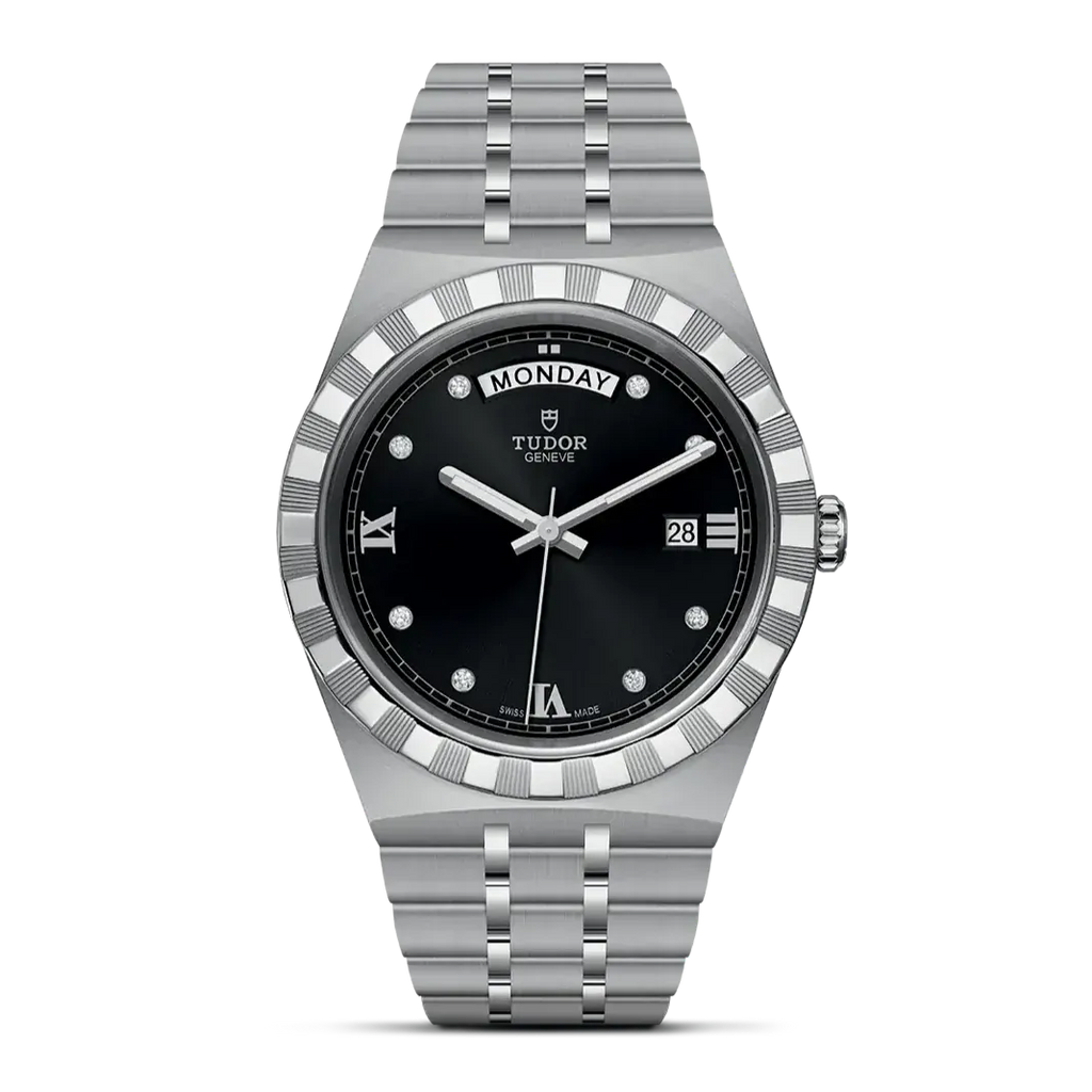 Brand New Authentic Tudor Royal Black Diamond Dial Steel Men's Watch Model M28600-0004. Stainless Steel case with Stainless Steel watch band. Folding clasp. Fluted bezel. Dial description: Silver tone hands and Diamond/Roman Numeral Hour markers with minute markers around the outer rim on a Black dial. Automatic movement. Powered by Tudor Calibre T603 engine with 38 hours power reserve. Watch functions: Date, Power Reserve, Hour, Minute, Second, Day. Screw Down crown. Scratch Resistant Sapphire crystal. Round case shape. Case size: 41mm. Solid case back. 100 Meters - 330 Feet water resistant.