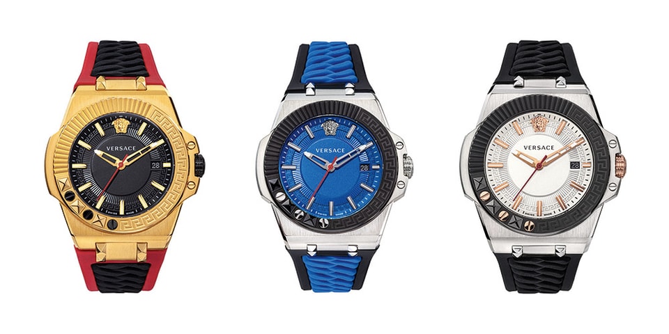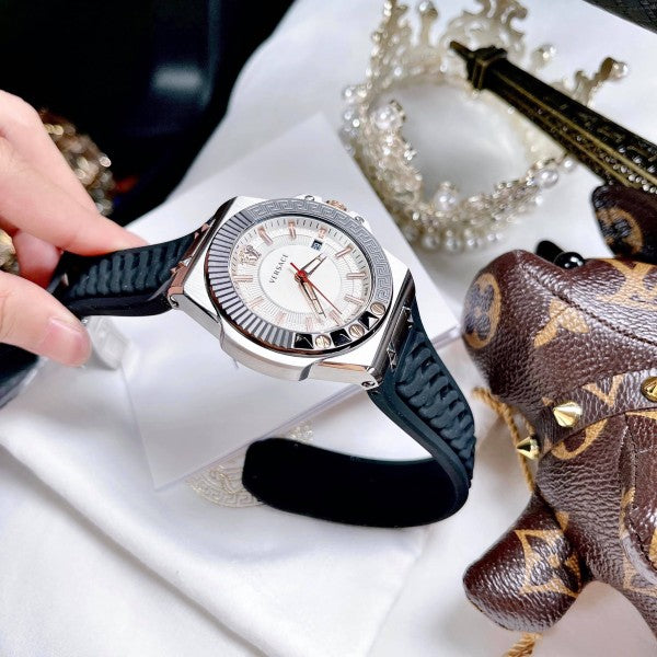 Stainless steel case with a black silicone strap. Fixed black ion-plated bezel. White (greca pattern) dial with rose gold-tone skeleton hands and index hour markers. Minute markers around the outer rim. The Medusa Head logo appears at the 12 o'clock position. Dial Type: Analog. Luminescent hands and markers. Date display at the 3 o'clock position. Quartz movement. Scratch resistant sapphire crystal. Solid case back. Round case shape. Case size: 45 mm. Band width: 20 mm. Butterfly clasp. Water resistant at 50 meters / 165 feet. Functions: date, hour, minute, second. Chain Reaction Series. Casual watch style. Watch label: Swiss Made. Versace Chain Reaction Quartz White Dial Mens Watch VEDY00219.