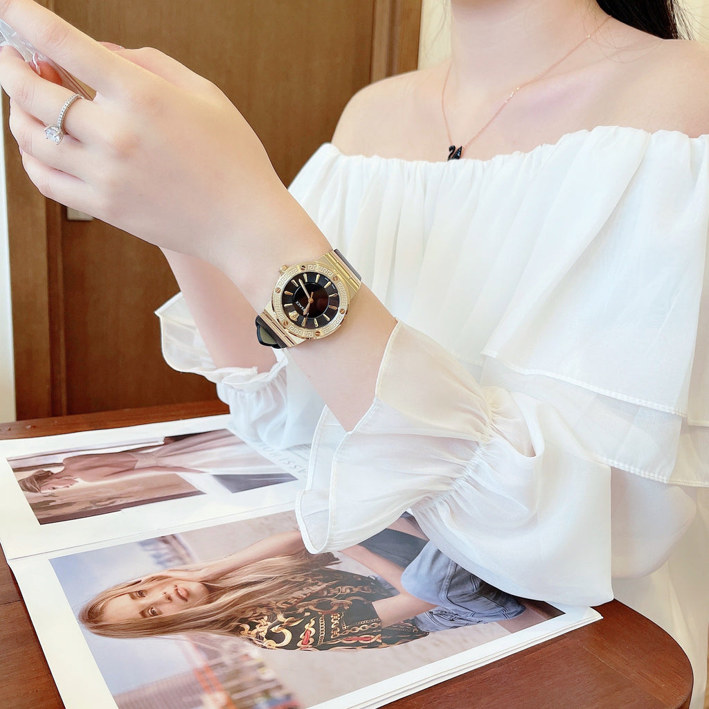 38mm x 9mm Brushed/Polished IP Gold Plated 316L Stainless Steel Case - Greca Engraved Bezel with Screw Accents - Solid Stainless Steel Caseback with Versace Engraving - Anti-Reflective Sapphire Crystal Glass - Push-Pull Crown.