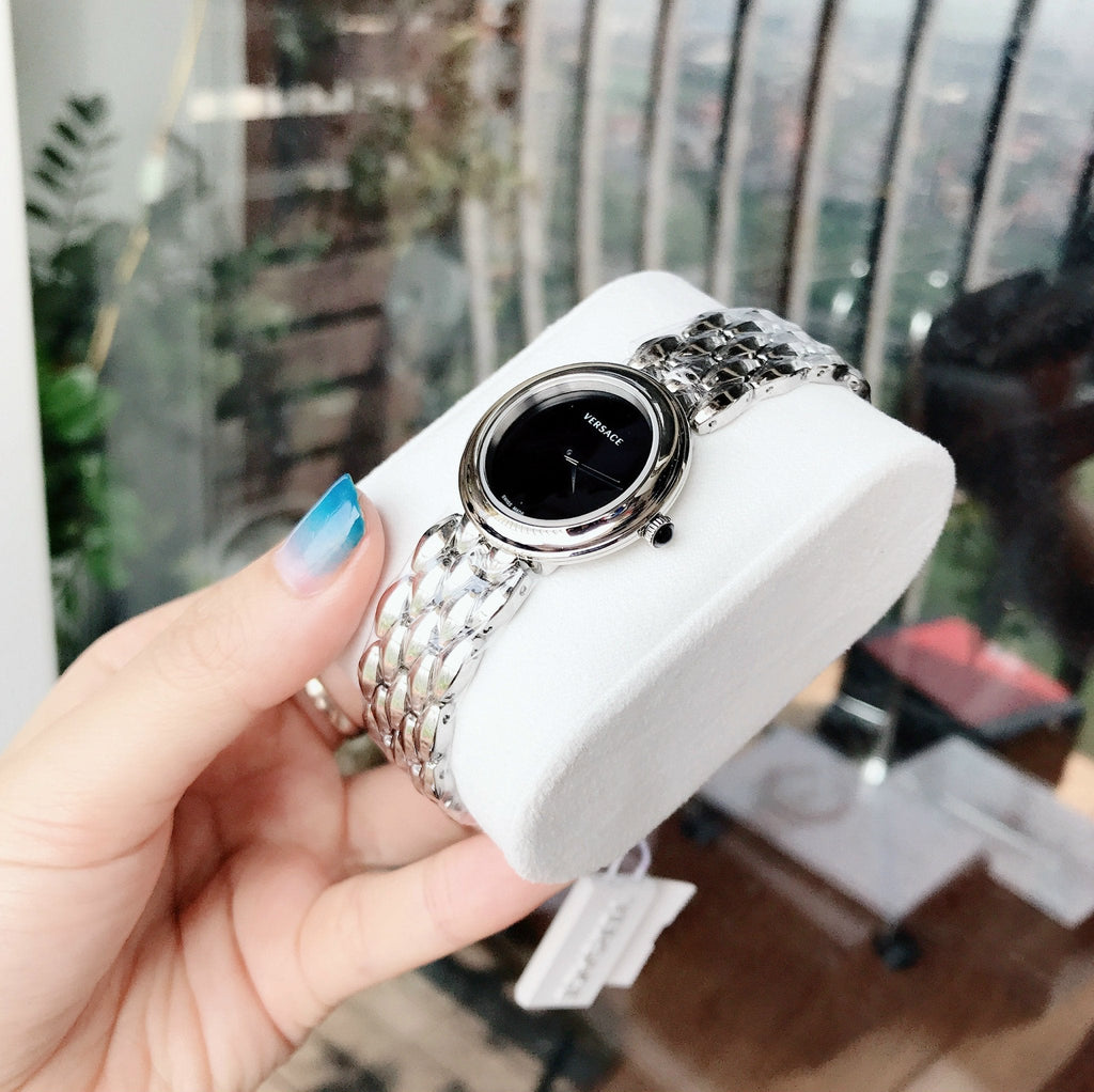 Elevate your style with the Versace V-Flare Quartz Black Dial Silver Steel Strap Watch for Women! This stunning timepiece features a bold black dial and sleek silver steel strap, exuding confidence and sophistication. Perfect for any occasion, this watch is a must-have in every fashionista's collection.