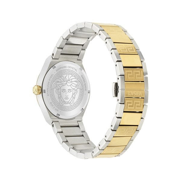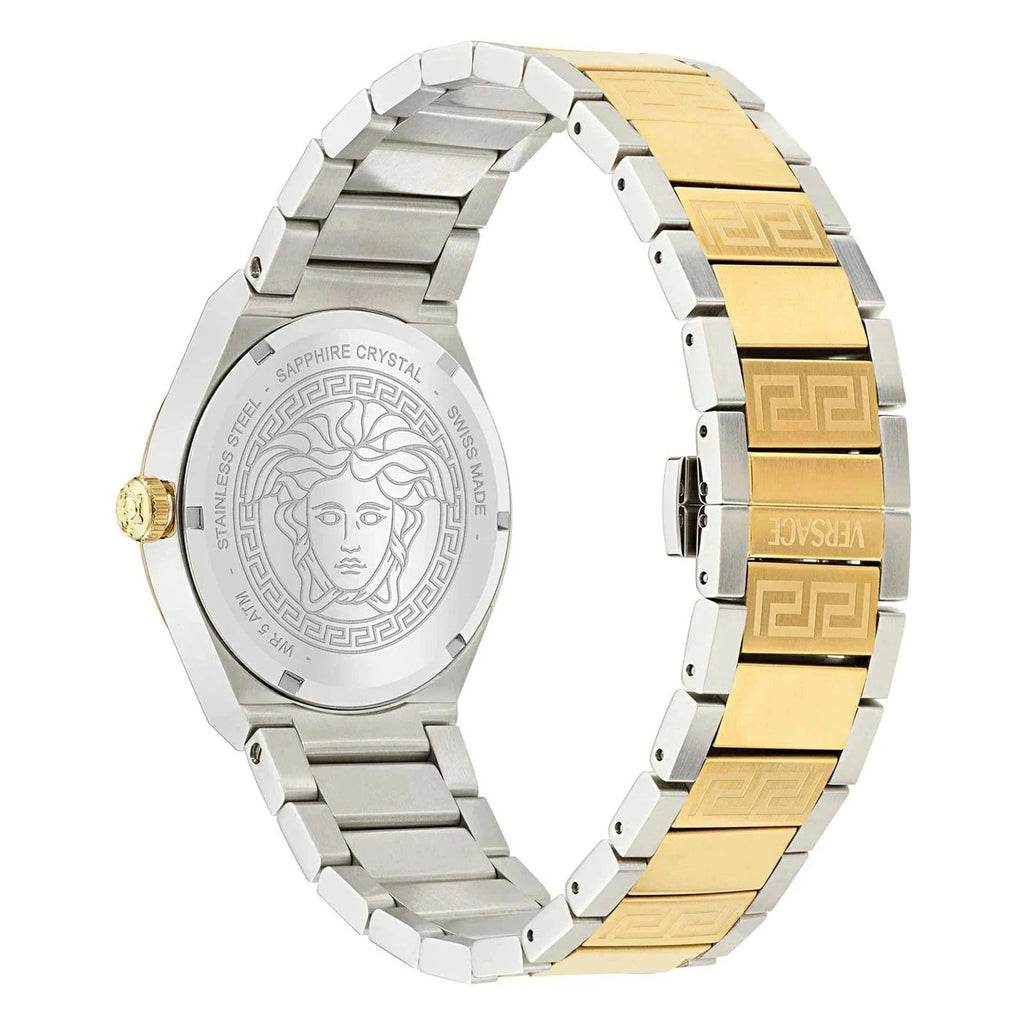 Elevate your style with the Versace V-AURIA VE0F00425. This stunning 39mm quartz watch features a luxurious silver-gray and gold steel bracelet, sapphire crystal, and a sophisticated butterfly clasp. Water-resistant up to 5 ATM, it's perfect for the modern man