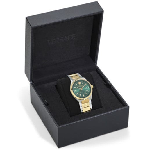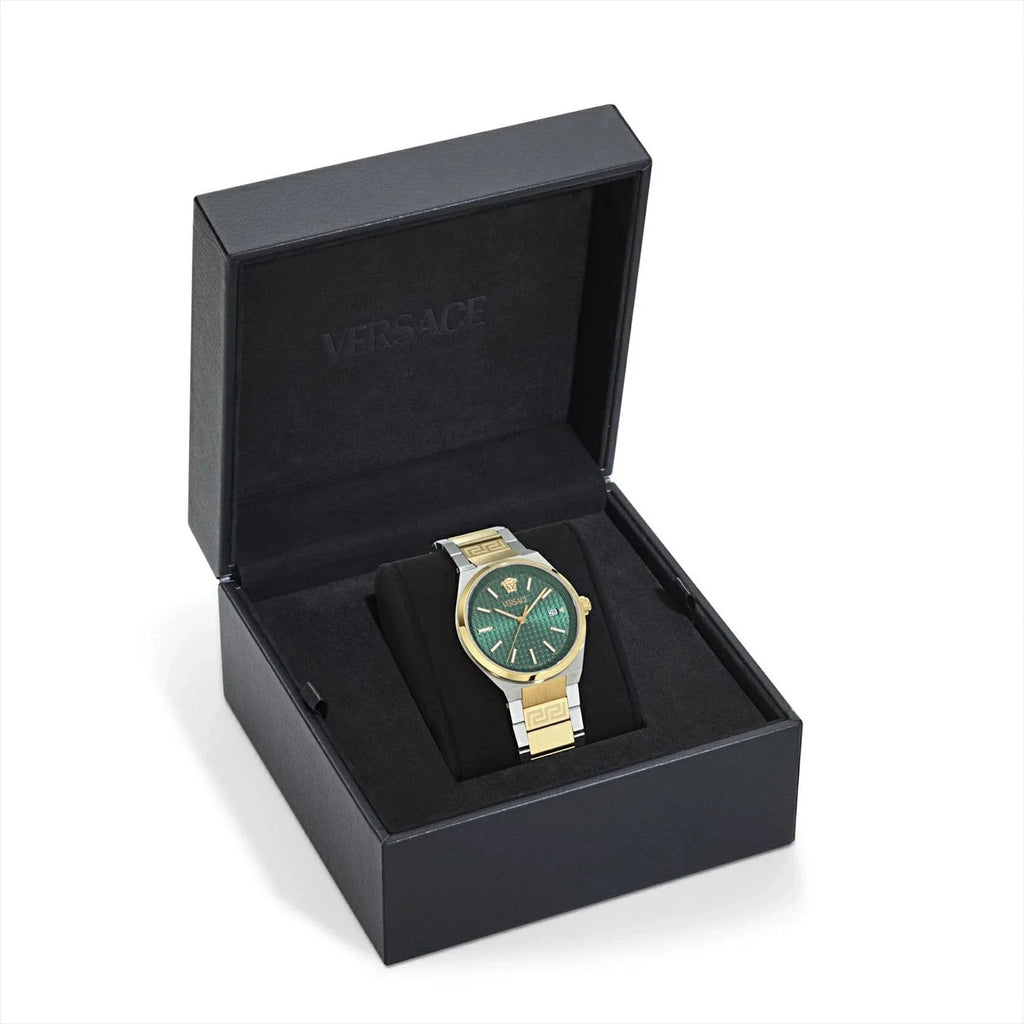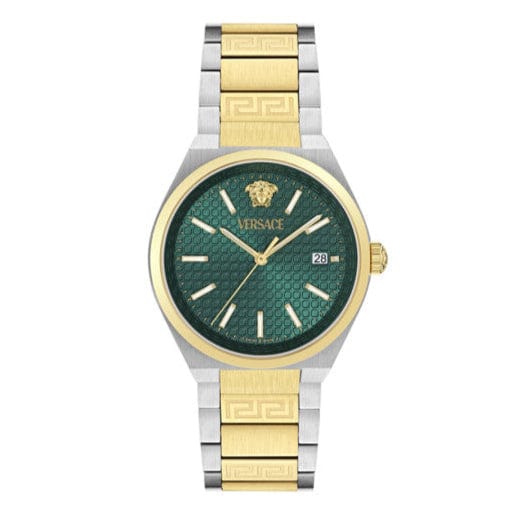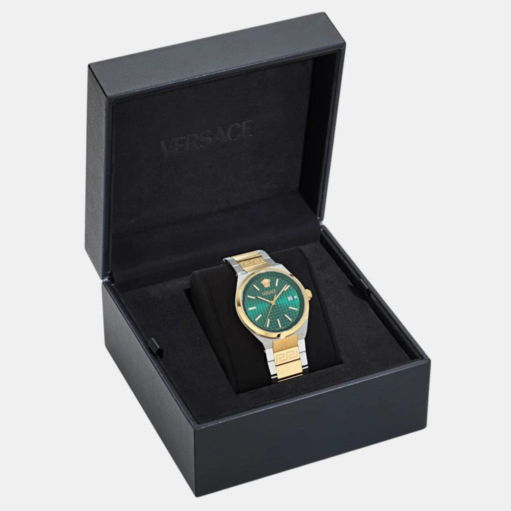 Elevate your style with the Versace V-Auria Quartz watch, featuring a striking green dial and a sophisticated two-tone steel strap. This men's timepiece blends bold design with precise quartz movement, ensuring reliable timekeeping. Its durable construction and elegant color combination make it perfect for both everyday wear and special occasions, adding a touch of luxury to your wrist.