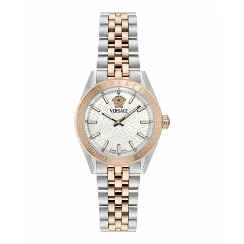 Elevate your style with the Versace V-Code Analog Watch for women. Featuring a sleek white dial and a sophisticated two-tone steel strap, this timepiece combines elegance with durability. Its refined design makes it perfect for both everyday wear and special occasions, ensuring you always make a lasting impression. Experience luxury and precision with Versace’s signature craftsmanship on your wrist.