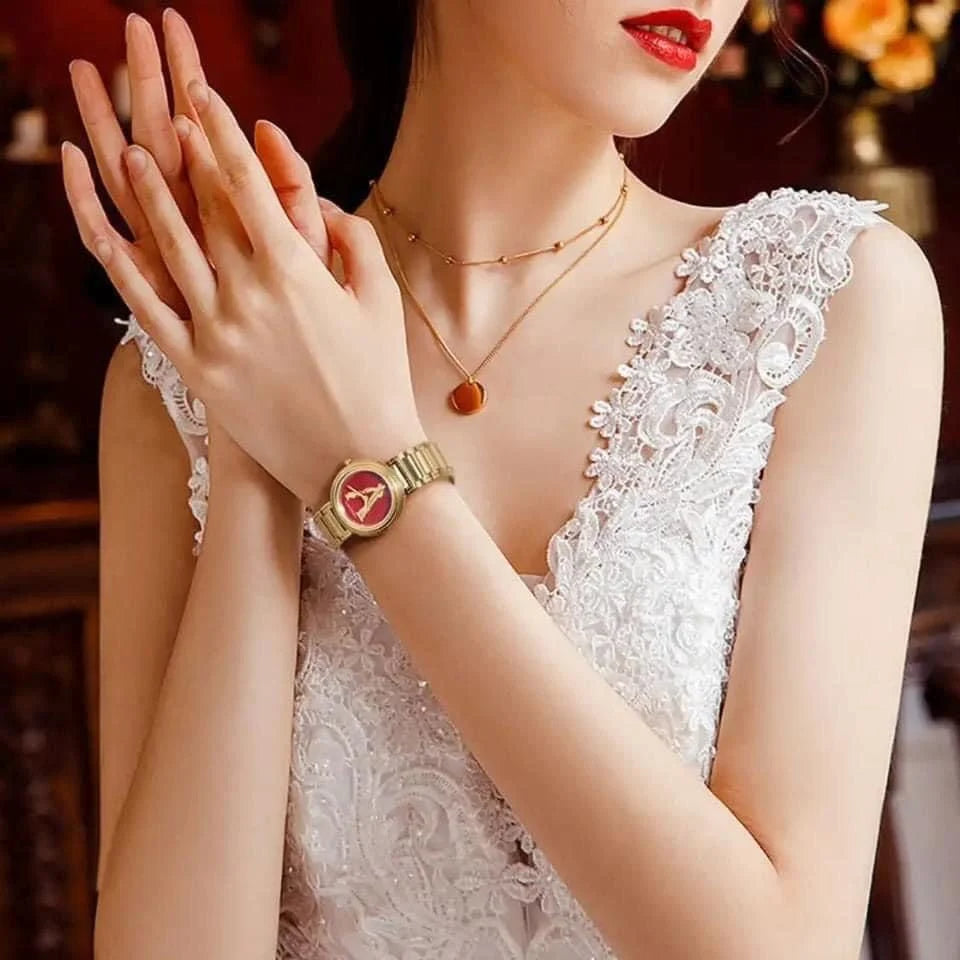 Versace Virtus Mini Quartz Red Dial Gold Steel Strap Watch For Women - VET300321