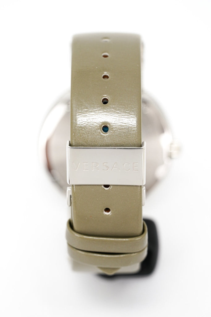 37mm x 8.5mm Polished 316L Stainless Steel Case with Versace Shape Cutout Bezel. Solid 316L Stainless Steel Caseback with Medusa Head Engraving. Anti-Reflective Sapphire Crystal Glass. Push-Pull Crown.