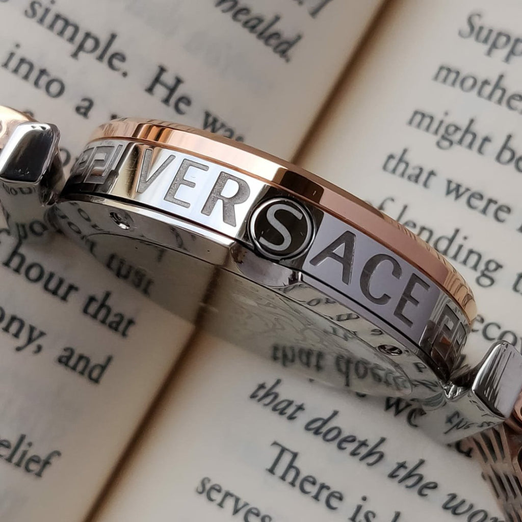Features: Powered by original Japanese Quartz machinery, Stainless-steel silver round greca engraved case with rosegold bezel, Anti-reflection sapphire crystal on a white texture dial with rosegold indices and hands, fastened by a stainless steel two-tone silver and rosegold chain.