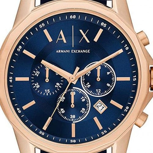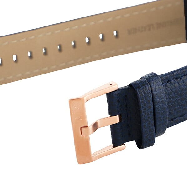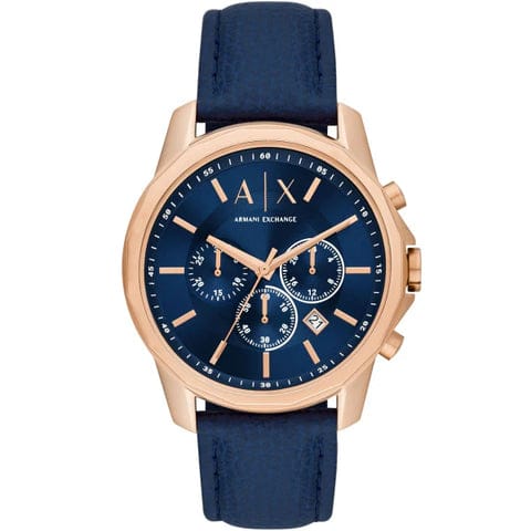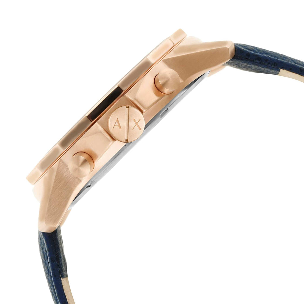 - Armani Exchange's 44mm watch features a blue cd texture and sunray dial with rose gold-tone stick indexes, chronograph movement and blue leather strap.
