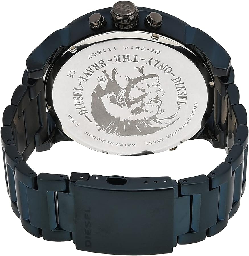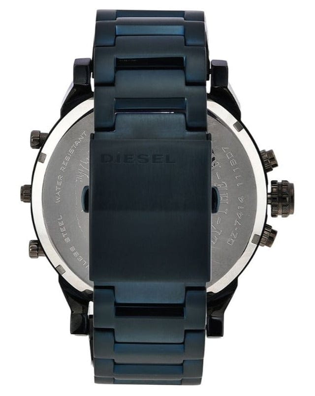 Quartz movement. Scratch resistant mineral crystal. Pull / push crown. Solid case back. Round case shape. Case dimensions: 66 mm x 57 mm. Case thickness: 14 mm. Band width: 28 mm. Deployant clasp. Water resistant at 30 meters / 100 feet. Functions: chronograph, date, hour, minute, second, four time zones. Mr. Daddy 2.0 Series. Sport watch style. Watch label: Japan Movt. Diesel Mr. Daddy 2.0 Chronograph Quartz Grey Dial Men's Watch DZ7414.