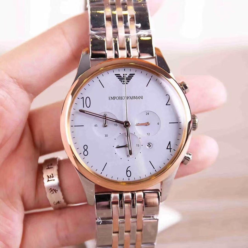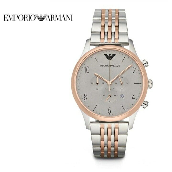 Stainless steel case with a two-tone (silver and rose gold-tone) stainless steel bracelet. Fixed rose gold-tone bezel. Grey dial with rose gold-tone hands and Arabic numeral and index hour markers. Minute markers around the outer rim. The Emporio Armani logo appears at 12 o'clock. Dial Type: Analog. Luminescent hands and markers. Date display between 4 and 5 o'clock positions. Chronograph - three sub-dials displaying: 60 seconds, 60 minutes, and 24 hours. Quartz movement. Scratch-resistant mineral crystal. Pull/push crown. Solid case back. Case diameter: 43 mm. Case thickness: 12 mm. Round case shape. Band width: 18 mm. Deployment clasp with push-button release. Water-resistant at 50 meters / 165 feet. Functions: chronograph, date, hour, minute, second. Casual watch style. Emporio Armani Beta Chronograph Grey Dial Two-tone Men's Watch AR1864.