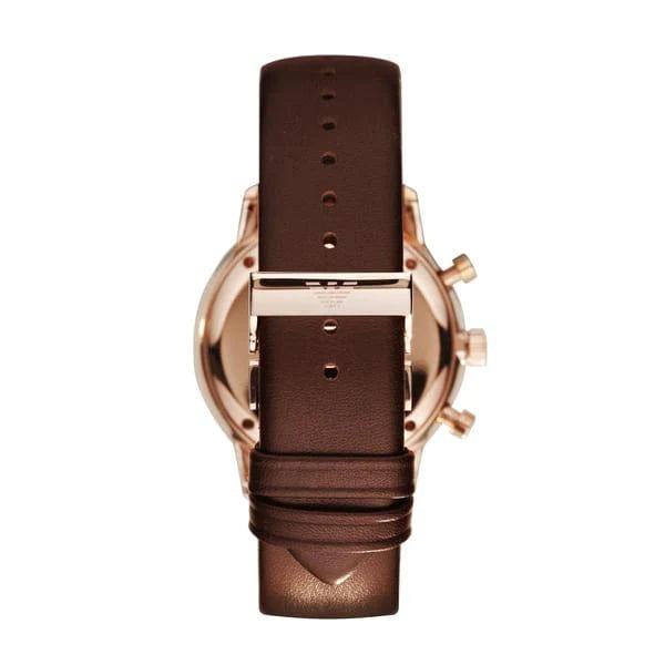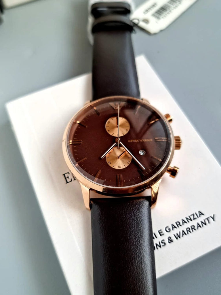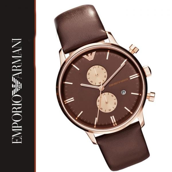 This Emporio Armani AR0387 watch features a rose gold-tone stainless steel case with a brown dial. A matching leather strap completes the look