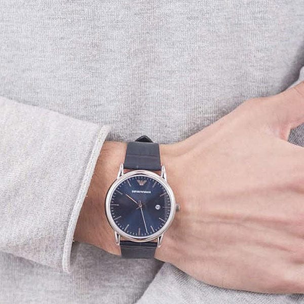 This contemporary Emporio Armani stainless-steel watch features a minimalist blue sunray dial, date window and croco-embossed blue leather strap.