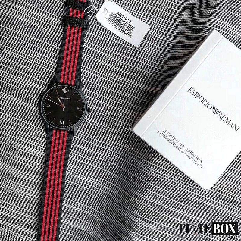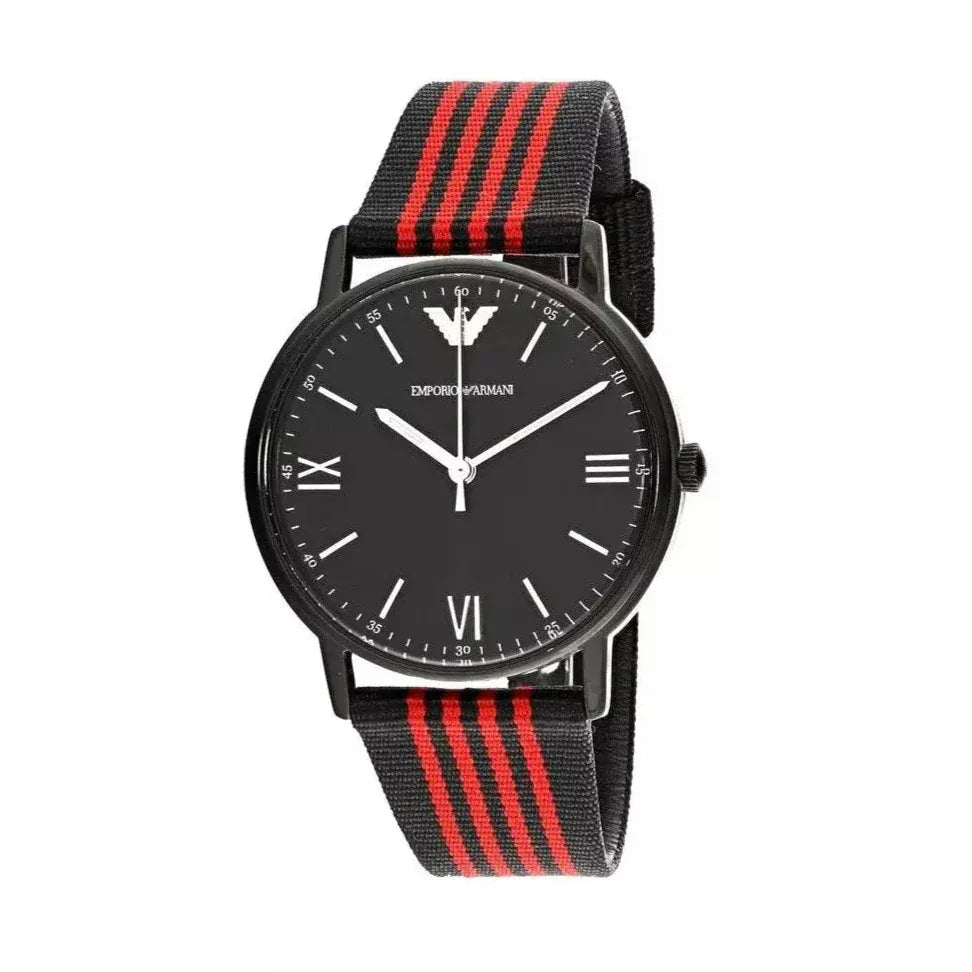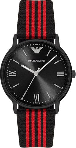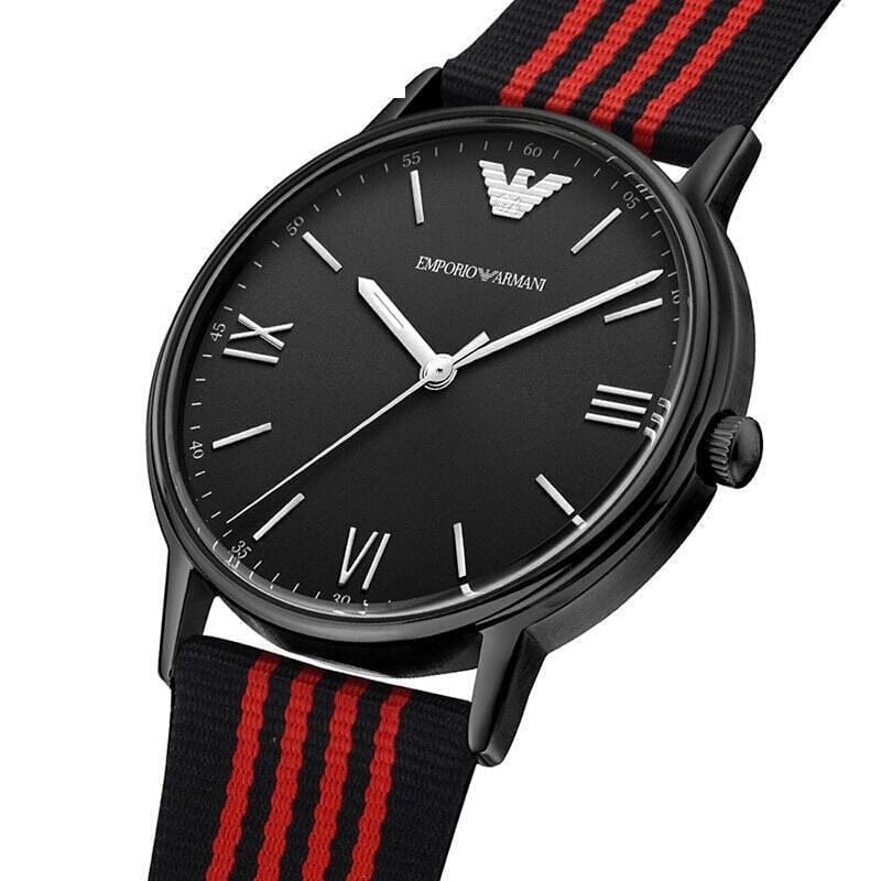 With Emporio Armani AR11015 Kappa NATO Fabric you discover the world of style and individuality. The black dial, wrapped by the textile strap in an expressive red-black design, gives you a feeling of spectacular modernity. With polished black steel, this watch is not just an accessory, but an elegant expression of your style. And that's affordability you can afford. With AR11015, you wear a brand that emphasizes your individuality.