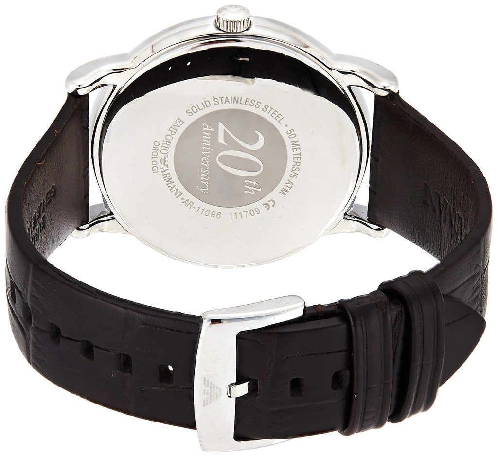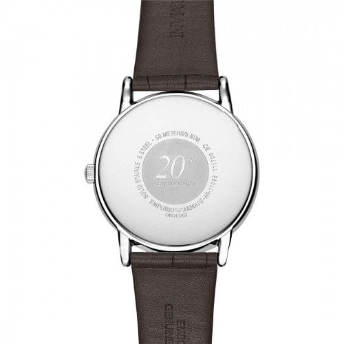 It features a brown textured leather strap, a polished stainless steel case and has a light brown with three hand movement and date window dial. The AR11096 comes with an official Emporio Armani Watches 2 year guarantee.