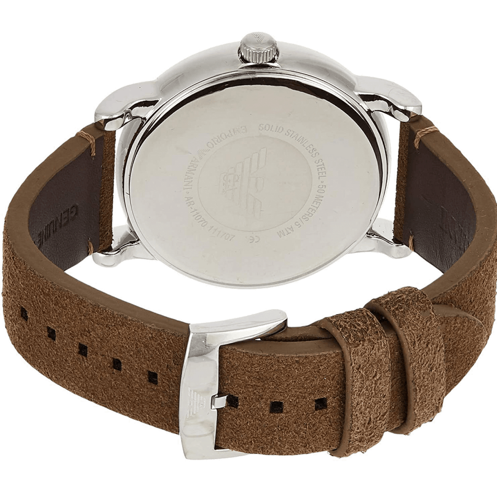 Emporio Armani AR-11070 is a rustic men's watch with a silver tone case , a grey 43 mm dial and brown leather strap.