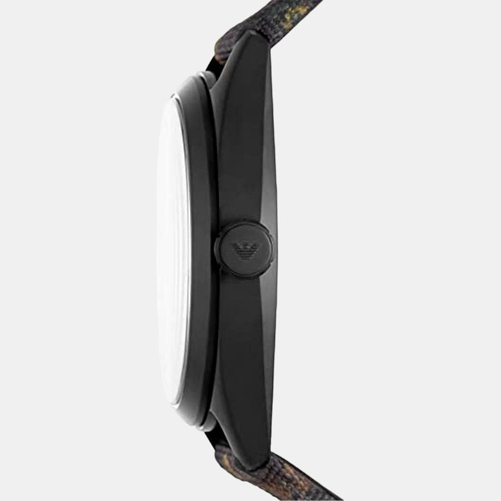 Black ion-plated stainless steel case with a dark brown leather strap. Fixed black ion-plated bezel. Beige sunray dial with luminous silver-tone hands and index hour markers. Minute markers around the outer rim. The Emporio Armani logo appears at the 12 o'clock position. Dial Type: Analog. Luminescent hands and markers. Date display at the 4 o'clock position. Quartz movement.