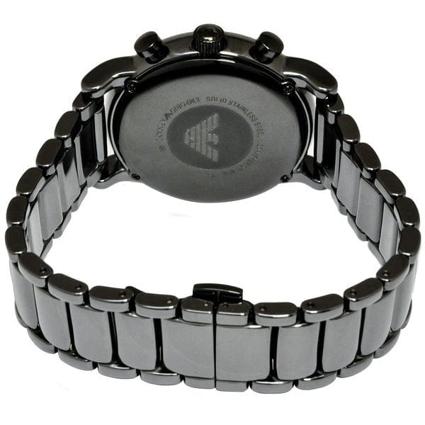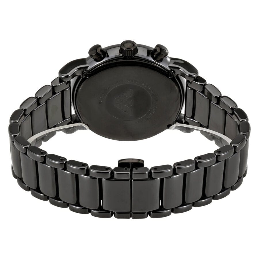 Black ceramic case with a black ceramic bracelet. Fixed black ceramic bezel. Black dial with luminous silver-tone hands and index hour markers. Minute markers around the outer rim. The Emporio Armani logo appears at the 12 o'clock position. Dial Type: Analog. Luminescent hands and markers. Date display between the 4 and 5 o'clock positions. Chronograph - three sub-dials displaying: 60 second, 30 minute and 24 hour. Quartz movement. Scratch resistant mineral crystal. Solid case back. Case size: 43 mm. Case thickness: 11 mm. Round case shape. Band width: 22 mm. Deployment clasp. Water resistant at 50 meters / 165 feet. Functions: chronograph, date, hour, minute, second. Casual watch style. Emporio Armani Chronograph Black Dial Men's Watch AR1507