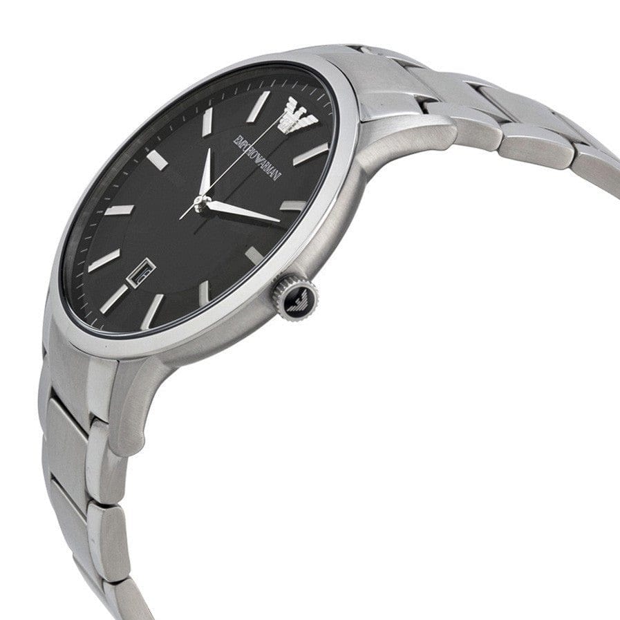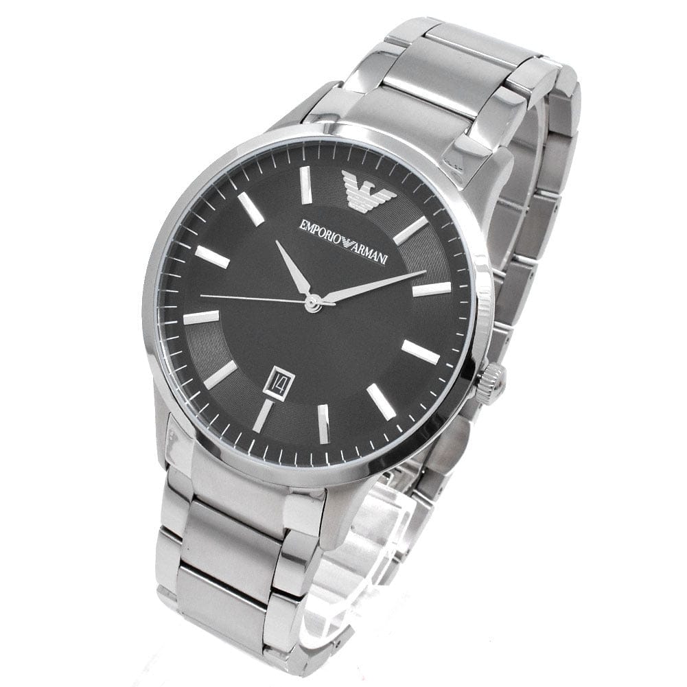 This Emporio Armani Sportivo Black Dial Stainless Steel Men's Watch AR2457 comes in stainless steel case with a stainless steel bracelet. Fixed stainless steel bezel. Black dial with silver-tone hands and index hour markers. The Emporio Armani logo appears at 12 o'clock. Minute markers around the outer rim. Dial Type: Analog. Date display at the 6 o'clock position. Quartz movement. Scratch resistant mineral crystal. Pull / push crown. Solid case back. Case diameter: 43 mm. Case thickness: 9 mm. Round case shape. Band width: 22 mm. Band length: 8 inches. Fold over clasp with a push button release. Water resistant at 50 meters / 165 feet. Functions: date, hour, minute, second. Casual watch style.
