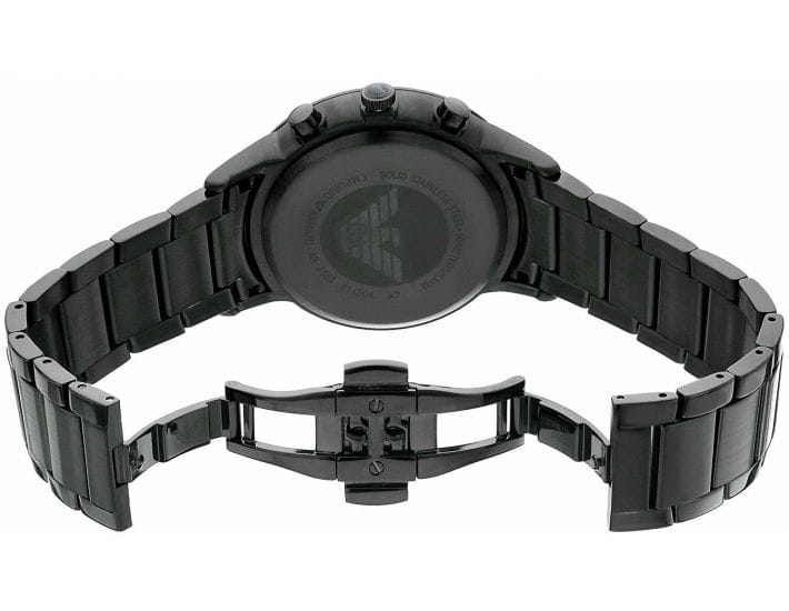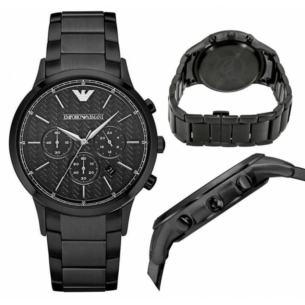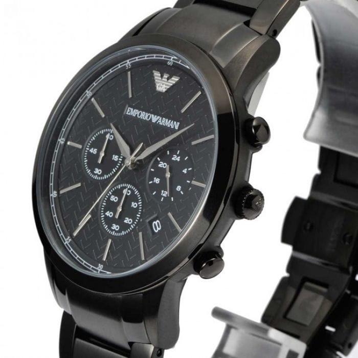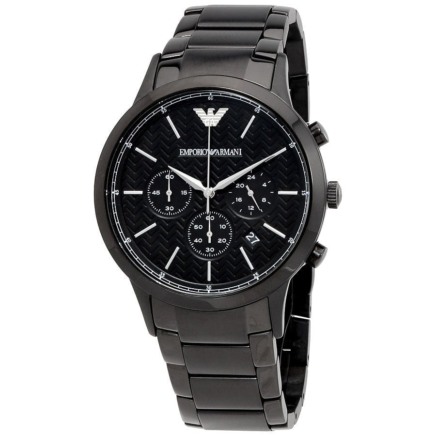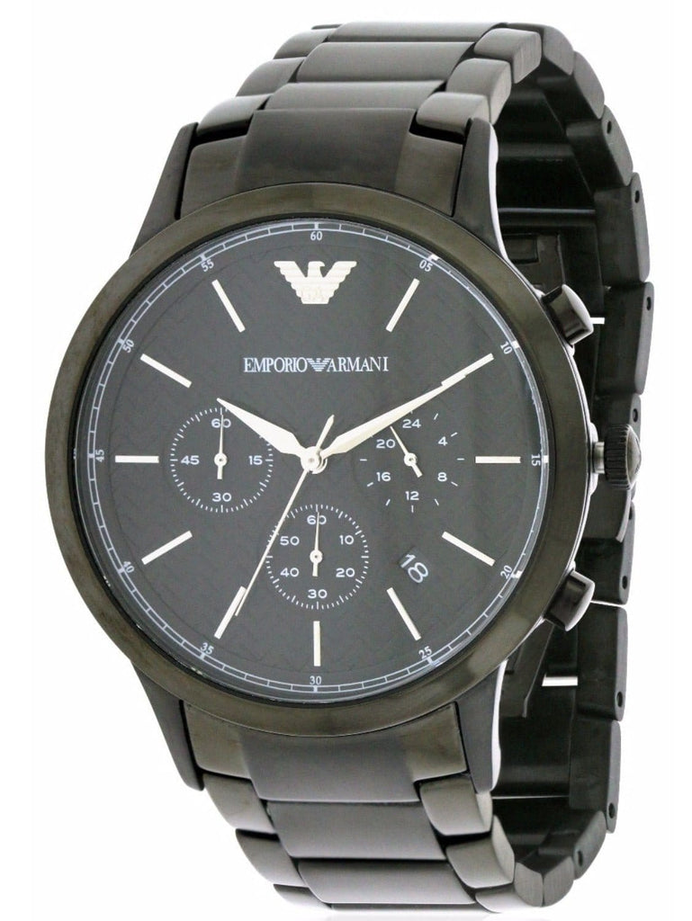 Black ion-plated stainless steel case and bracelet. Fixed black ion-plated bezel. Black (herringbone pattern) dial with silver-tone hands and index hour markers. Minute markers around the outer rim. The Emporio Armani logo appears at the 12 o'clock position. Dial Type: Analog. Date display between the 4 and 5 o'clock positions. Chronograph - three sub-dials displaying: 60 second, 60 minute and 24 hour. Quartz movement. Scratch resistant mineral crystal. Pull / push crown. Solid case back. Round case shape. Case size: 43 mm. Case thickness: 11 mm. Band width: 22 mm. Deployment clasp. Water resistant at 50 meters / 165 feet. Functions: chronograph, date, hour, minute, second. Dress Series. Dress watch style. Emporio Armani Dress Chronograph Quartz Men's Watch AR2485.