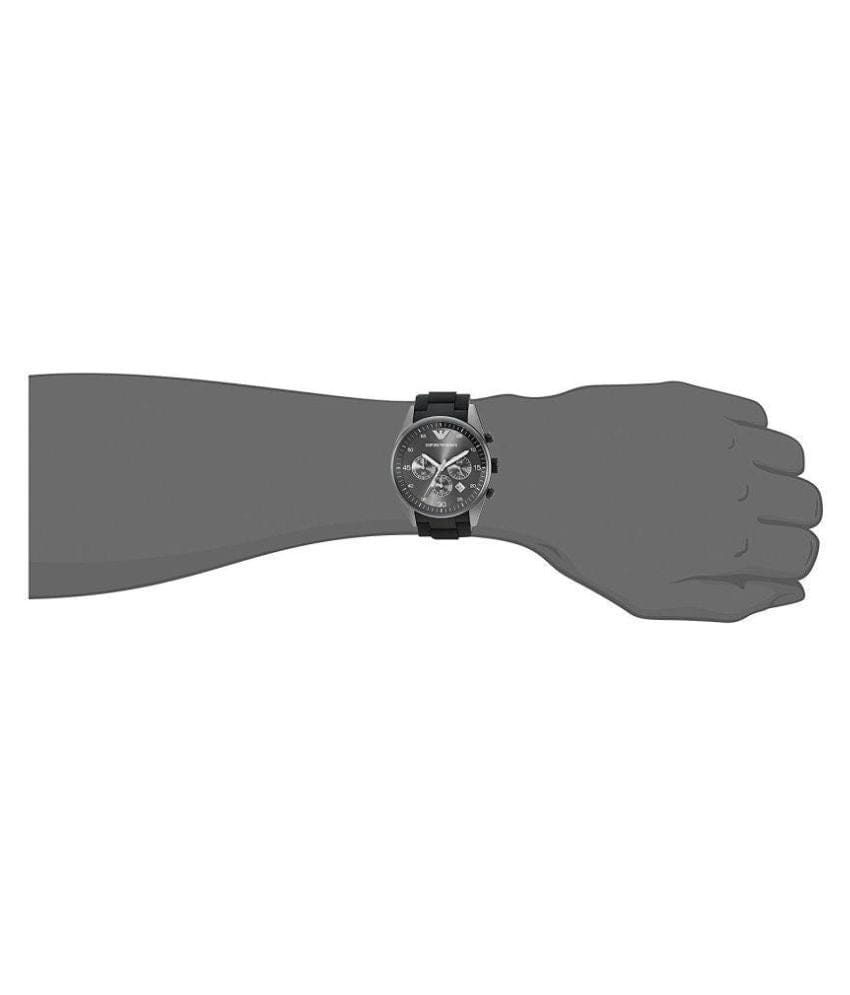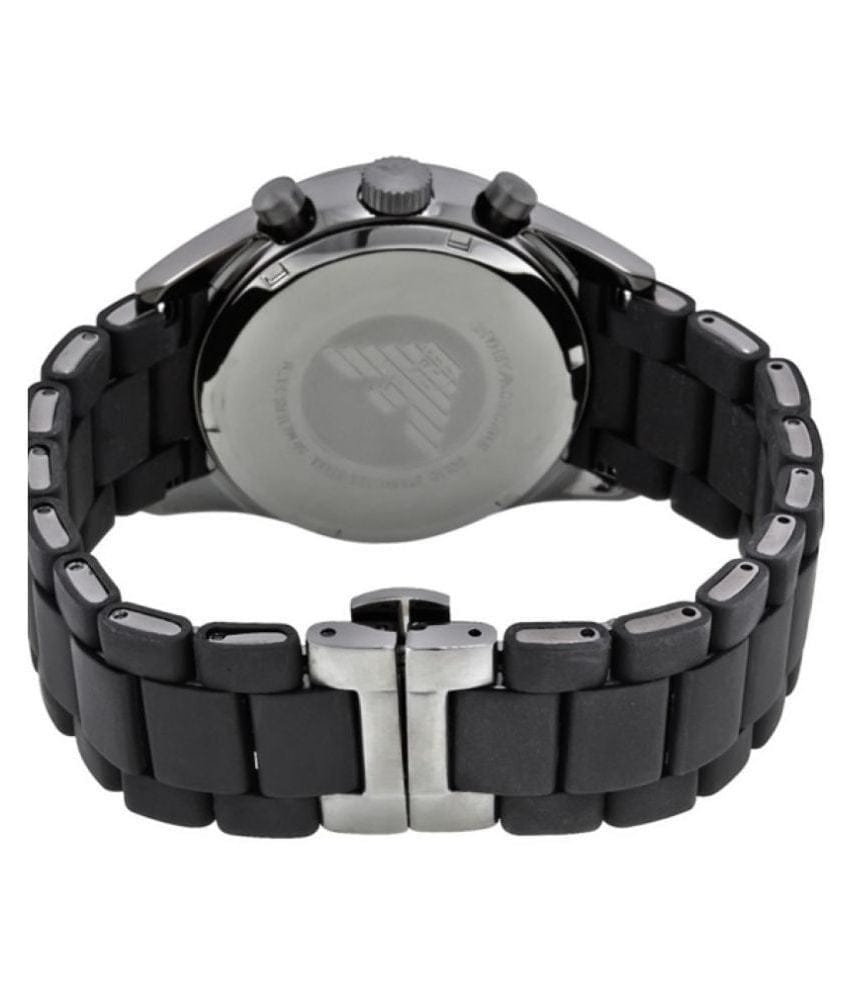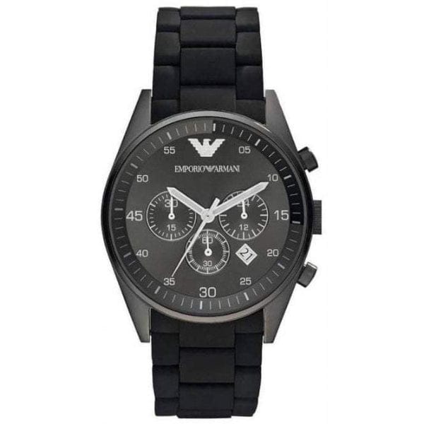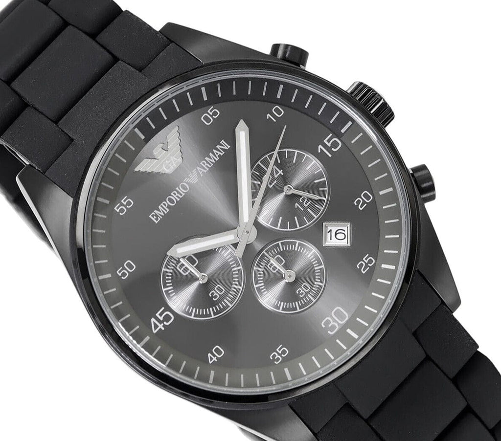 Fashion meets function with this chronograph watch from Emporio Armani. The Grey stainless steel case features a Black dial with three subdials (chronographs) and date window for added functionality. The Black Silicone covered Stainless Steel bracelet adds the finishing touch.