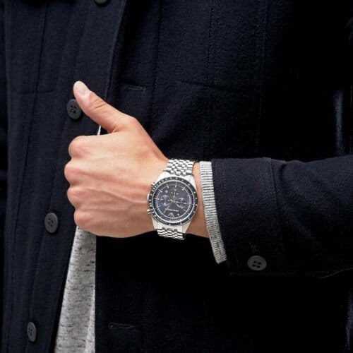 46mm x 13mm Stainless Steel Case. Solid Caseback. Blue Tachymeter Bezel.