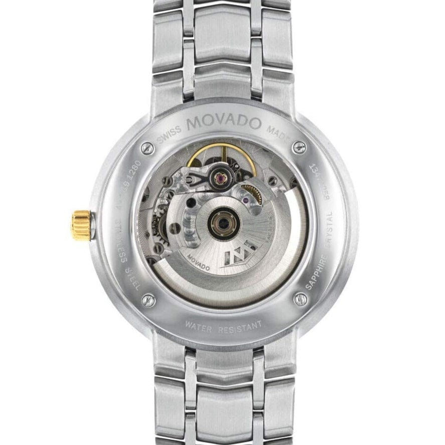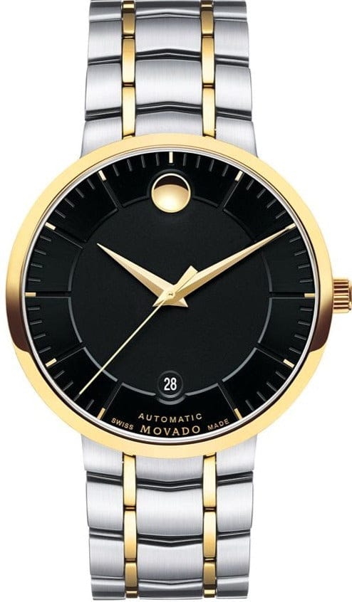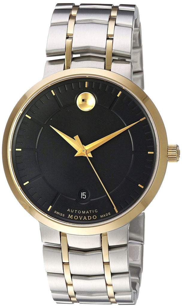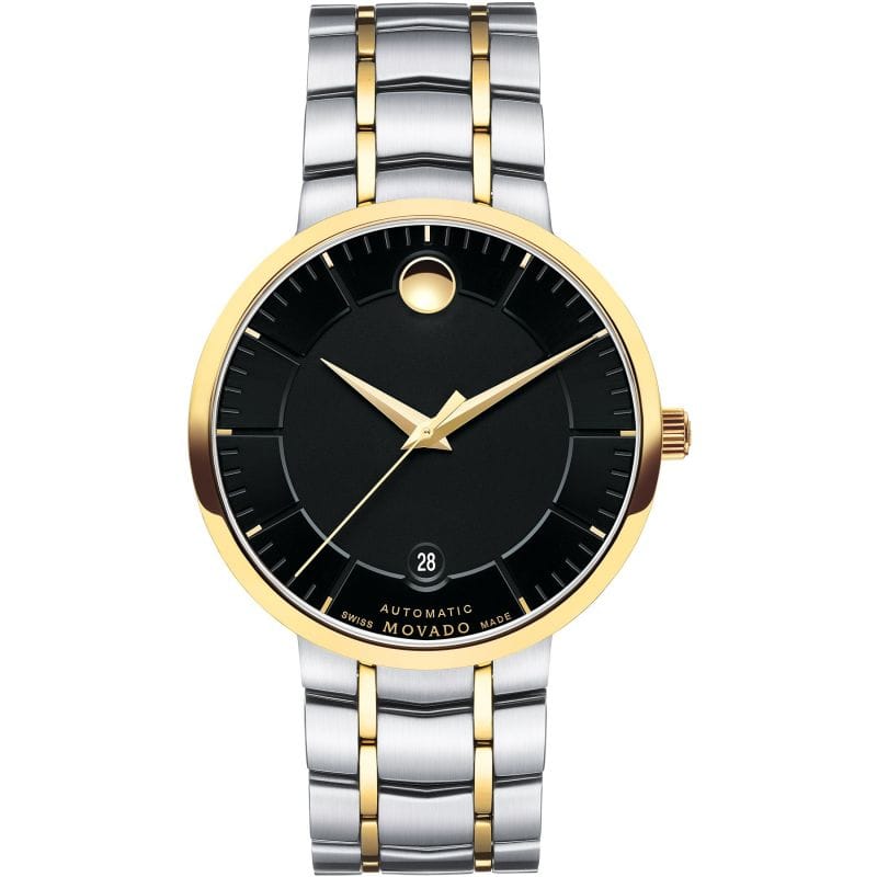 Movado Watch 1881 Automatic 606916. Mens 1881 Automatic watch, 39.5 mm stainless steel and yellow gold PVD finished case with exhibition back, round bi level black 3 hand dial with gold toned dot and hands, stamped hour markers and minute index, gold toned accents and round date display, two toned stainless steel bracelet with chevron shaped links and butterfly deployment clasp.