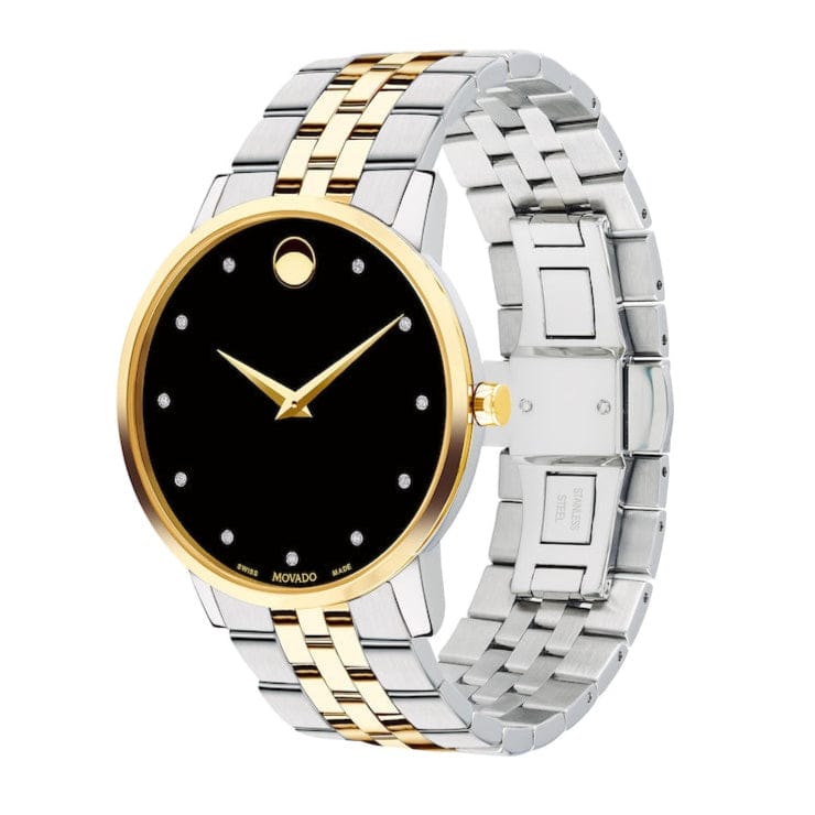 Stainless steel case with a two-tone (silver and yellow gold PVD) stainless steel bracelet. Fixed yellow gold PVD bezel. Black museum dial with yellow gold-tone hands and diamond hour markers. The Movado dot appears at the 12 o’clock position. Dial Type: Analog. Quartz movement.
