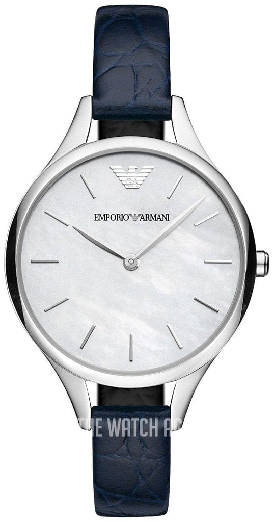 This Emporio Armani women's watch shines with its white shimmering mother-of-pearl dial, silver indices, its stainless steel case and the blue leather strap.