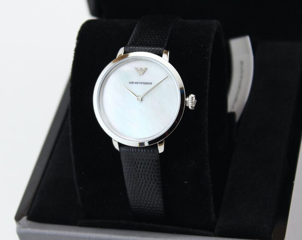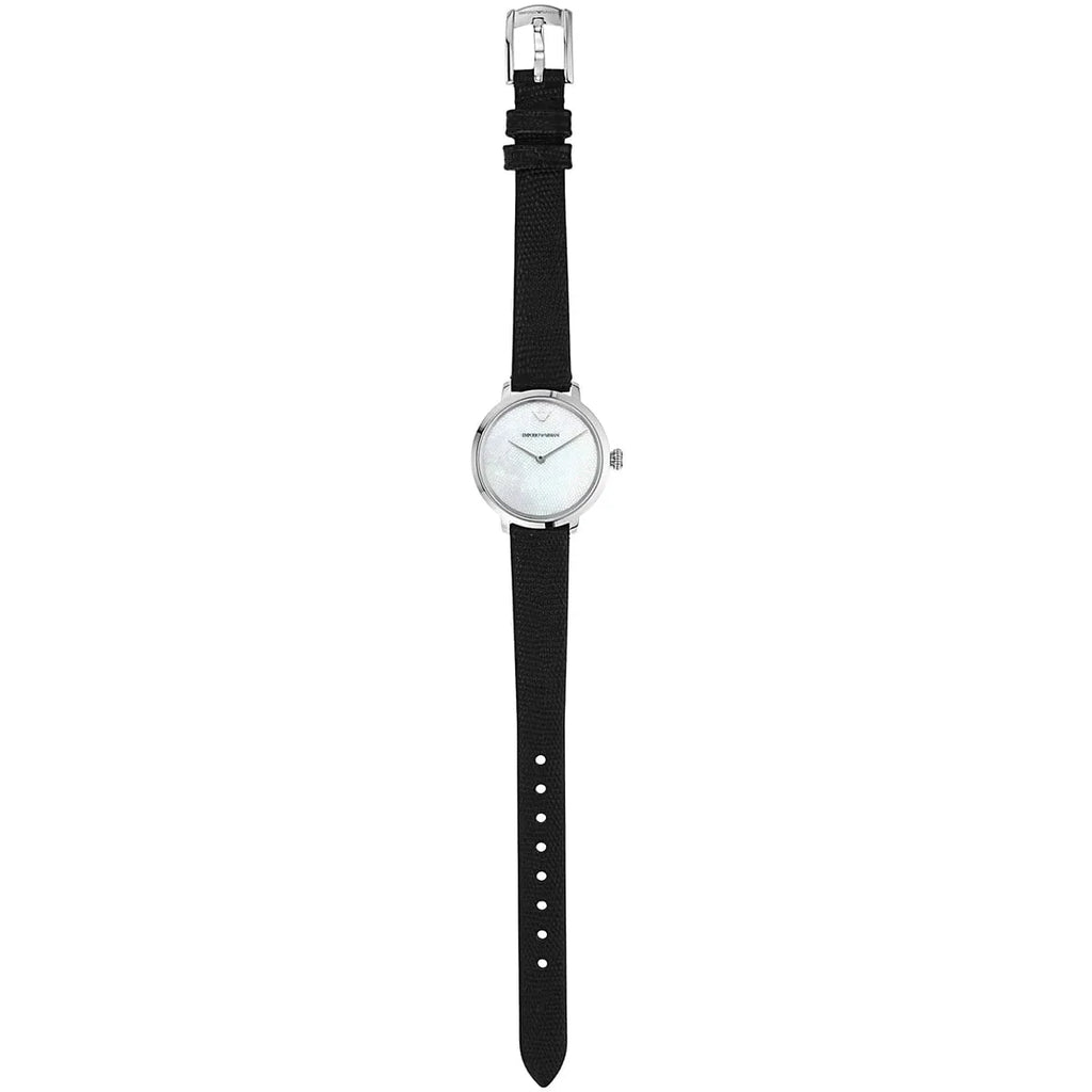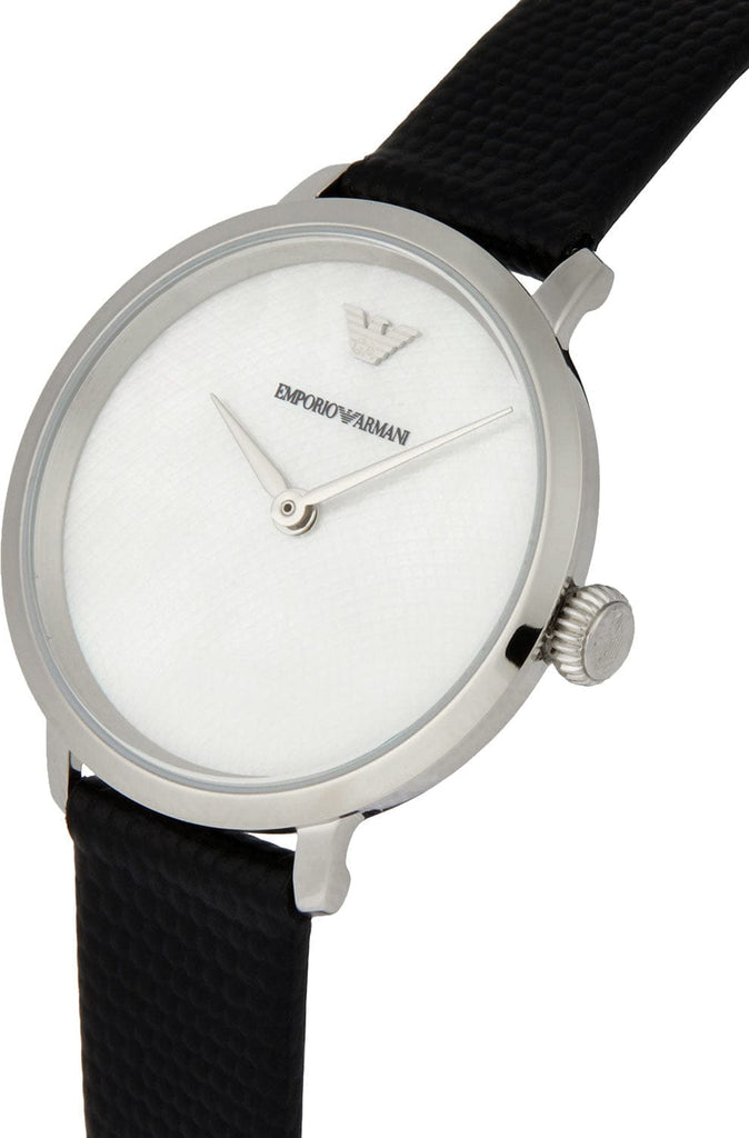 Stainless steel case with a black leather strap. Fixed stainless steel bezel. White mother of pearl dial with silver-tone hands. No markers. The Emporio Armani logo appears at the 12 o'clock position. Dial Type: Analog. Quartz movement. Scratch resistant mineral crystal. Pull / push crown. Solid case back.