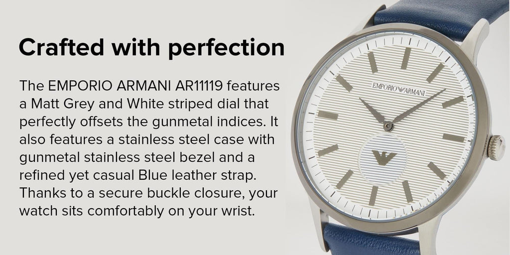 | Brand | Emporio Armani | Analogue/Digital | Analogue | Case depth approx. | 9.00mm | Case Shape | Circle | Case width approx. | 43.00mm | Dial Colour | Grey | Gender | Gents | Movement | Quartz | Strap colour | Blue | Strap Type | Leather strap | Water Resistance | 50 metres | BARCODE | 4053858984257 | Guarantee | 2 years |