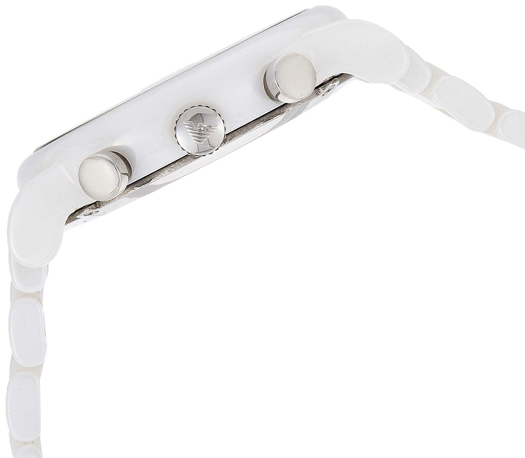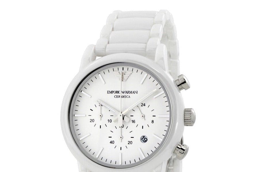 White ceramic case with a white ceramic bracelet. Fixed white ceramic bezel. White dial with rose gold-tone hands and index hour markers. Minute markers around the outer rim. The Emporio Armani logo marks the 12 o'clock position. Dial Type: Analog. Date display between the 4 and 5 o'clock positions. Chronograph - three sub-dials displaying: 60 second, 30 minute and 24 hours. Quartz movement. Scratch resistant mineral crystal. Pull / push crown. Solid case back. Case size: 43 mm. Case thickness: 11 mm. Round case shape. Band width: 22 mm. Deployment clasp. Water resistant at 50 meters / 165 feet. Functions: chronograph, date, hour, minute, second. Additional Info: in general, suitable for short periods of recreational swimming, but not diving or snorkeling. Casual watch style. Emporio Armani Luigi White Dial Men's Watch AR1499.