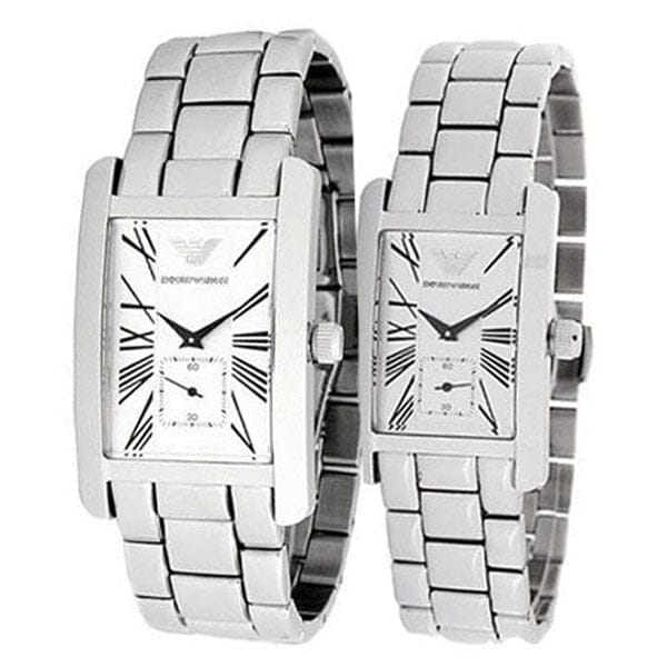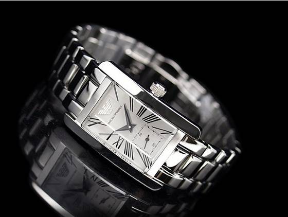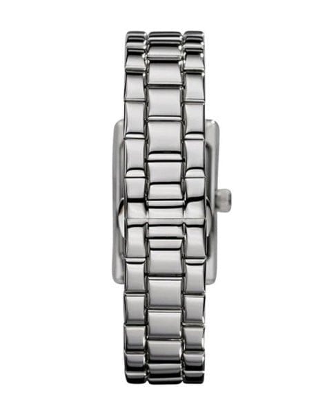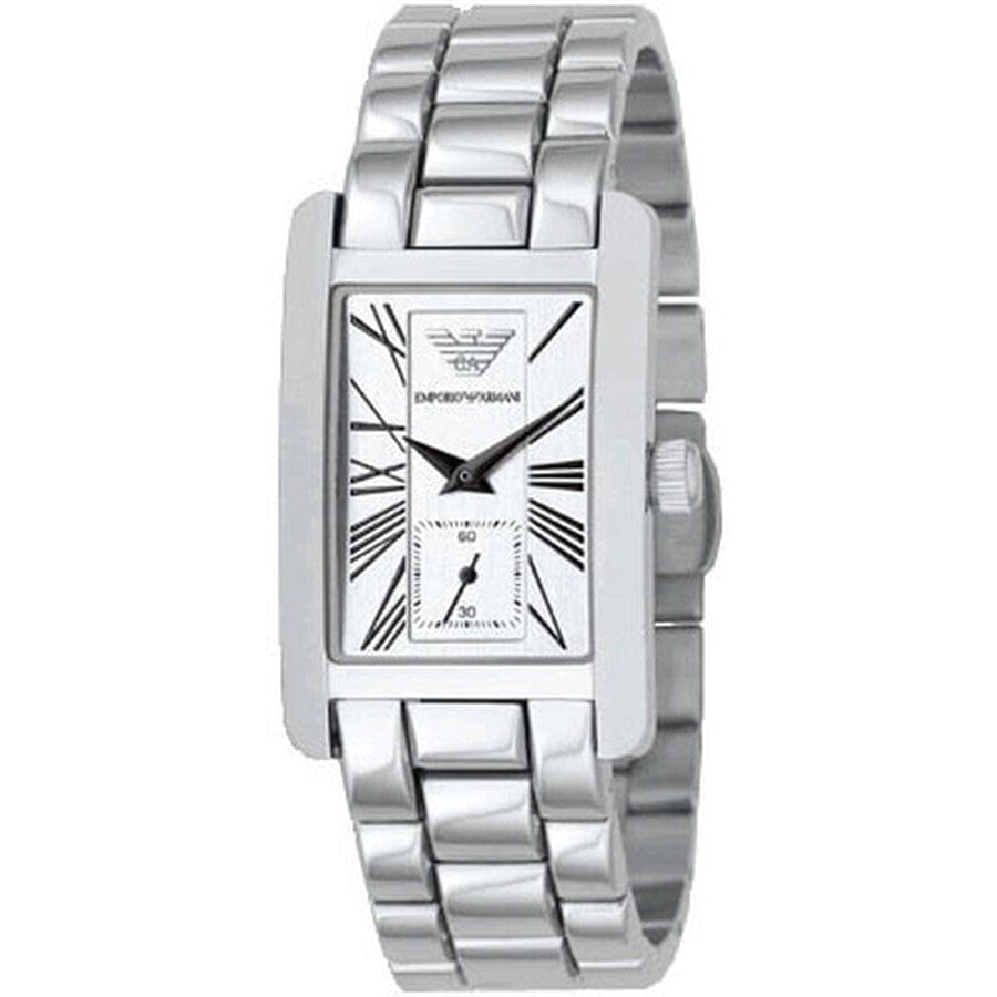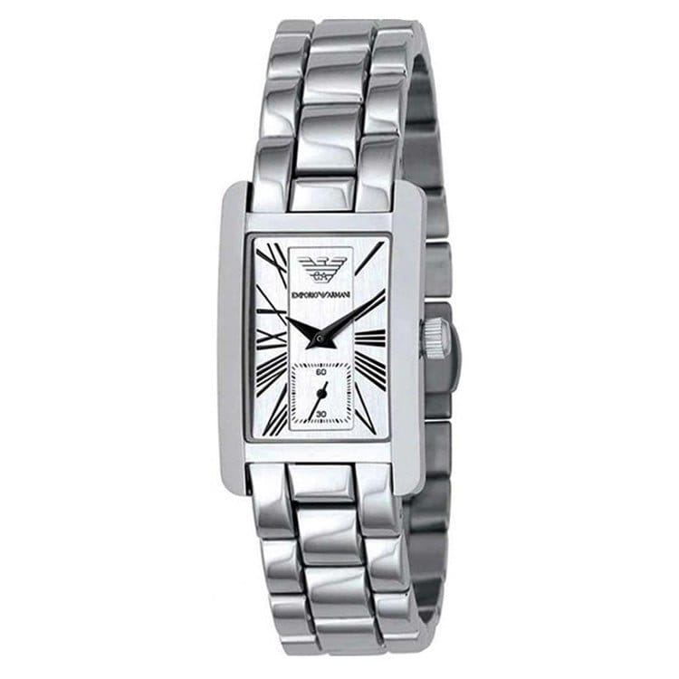 Silver-tone stainless steel case with a silver-tone stainless steel bracelet. Fixed silver-tone stainless steel bezel. Silver dial with black hands and Roman numeral hour markers. Dial Type: Analog. One - small second subdial. Quartz movement. Scratch resistant mineral crystal. Pull / push crown. Solid case back. Rectangle case shape. Case size: 25 mm. Band width: 18 mm. Hidden push button deployment clasp. Water resistant at 50 meters / 165 feet. Functions: hour, minute, small second. Fashion watch style. Emporio Armani Steel Ladies Watch Ar0146.