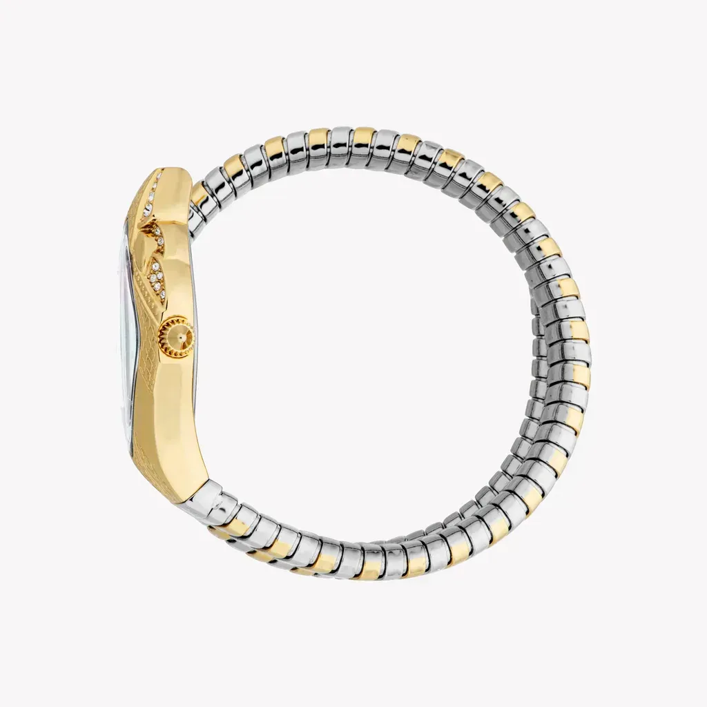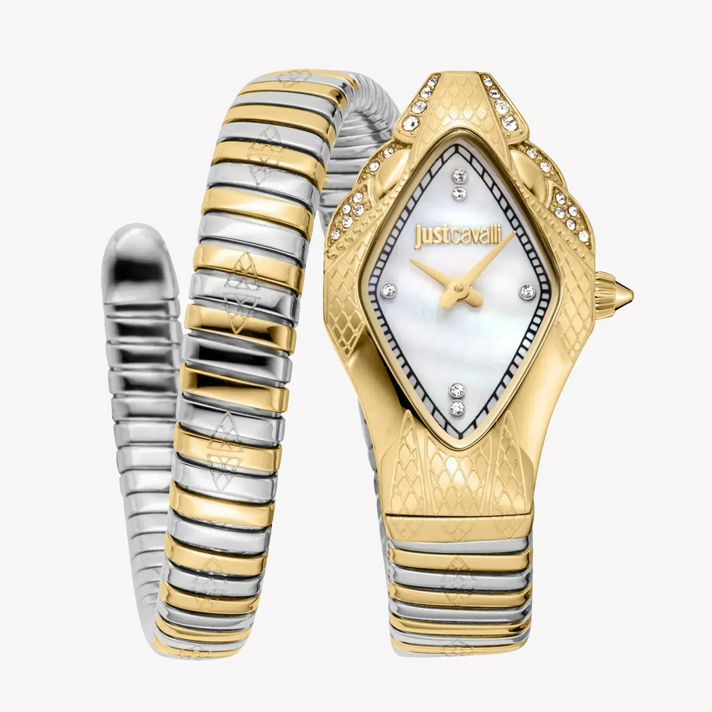 Presenting the Just Cavalli Women's Watch, a remarkable fusion of chic design and exceptional accuracy. This stunning timepiece is more than mere utility; it’s a bold expression of your individuality. Featuring a captivating Two-Tone Silver & Gold Stainless Steel Band, along with an Asymmetrical Gold Stainless Steel Case sized at 22 x 36.5 mm, this watch captures the essence of avant-garde sophistication. The radiant White Mother of Pearls Dial adds a layer of charm, ensuring it stands out in any setting.