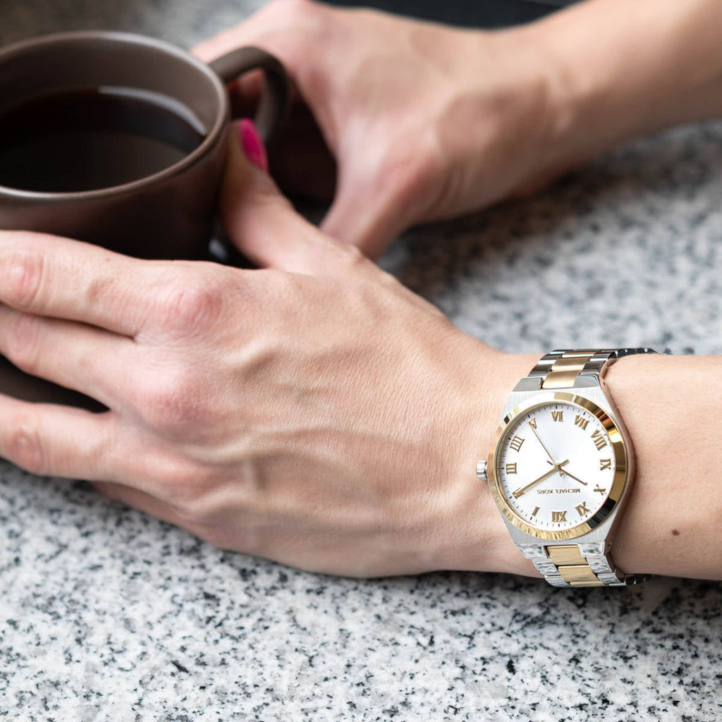 Michael Kors' 37mm Lennox watch features a white sunray dial, three-hand movement and two-tone stainless steel bracelet.