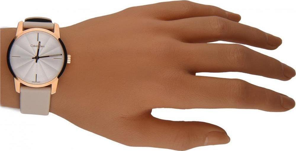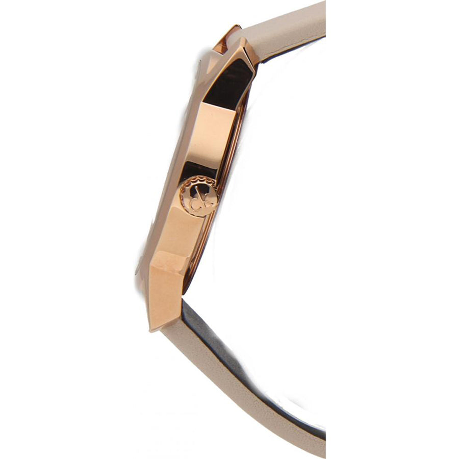 This ladies Calvin Klein City watch has a PVD rose plating case and is powered by a quartz movement.Textured silver tone dial. High-quality cream leather strap.