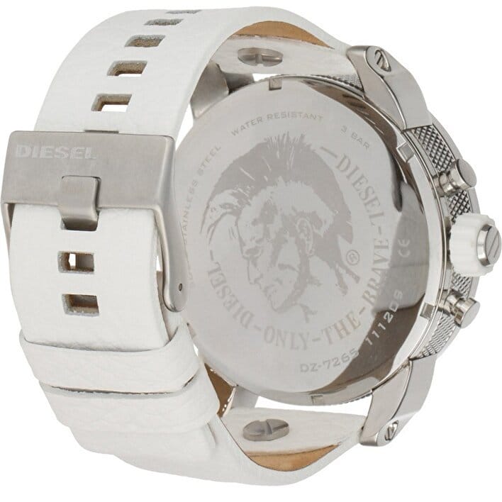 Stainless steel case with a white leather strap. Fixed stainless steel bezel. Silver white dial with luminous blue hands and index hour markers. Second time zone on rotating disk. Dial Type: Analog. Luminescent hands and markers. Date display at the 3 o'clock position. Chronograph - three sub-dials displaying: 60 second, 30 minute and 24 hour. Quartz movement. Scratch resistant mineral crystal. Pull / push crown. Solid case back. Case diameter: 52 mm. Case thickness: 13 mm. Oval case shape. Band width: 24 mm. Band length: 8.5 inches. Tang clasp. Water resistant at 50 meters / 165 feet. Functions: chronograph, date, hour, minute, second. Casual watch style. Diesel Bass Ass Chronograph White Dial White Leather Men's Watch DZ7265.