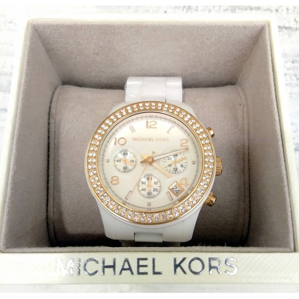 White ceramic case with a white ceramic link bracelet. Fixed rose gold-tone bezel set with Swarovski crystals. White dial with luminous hands and alternating Arabic numeral and stick hour markers. Minute markers around the inner bezel. Luminescent hands and markets. Date display appears between the 4 and 5 o'clock positions. Chronograph - three sub-dials displaying: 60 seconds, 60 minutes and 24 hours. Quartz movement. Scratch resistant mineral crystal. Push / pull crown. Solid case back. Case diameter: 39 mm. Case thickness: 15 mm. Butterfly clasp. Water resistant at 50 meters / 165 feet. Functions: chronograph: hours, minutes, seconds, date. Michael Kors White Ceramic White Dial Ladies Watch MK5269.