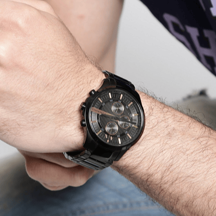 This Armani Exchange watch features a sleek black steel strap and a black chronograph dial. Perfect for any occasion, this watch combines style and functionality. Stay fashionable and on time with the Armani Exchange Hampton Chronograph Black Dial Black Steel Strap Watch for Men!