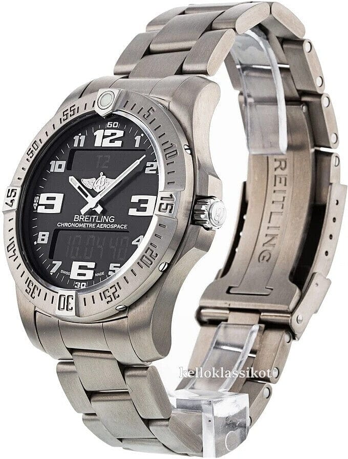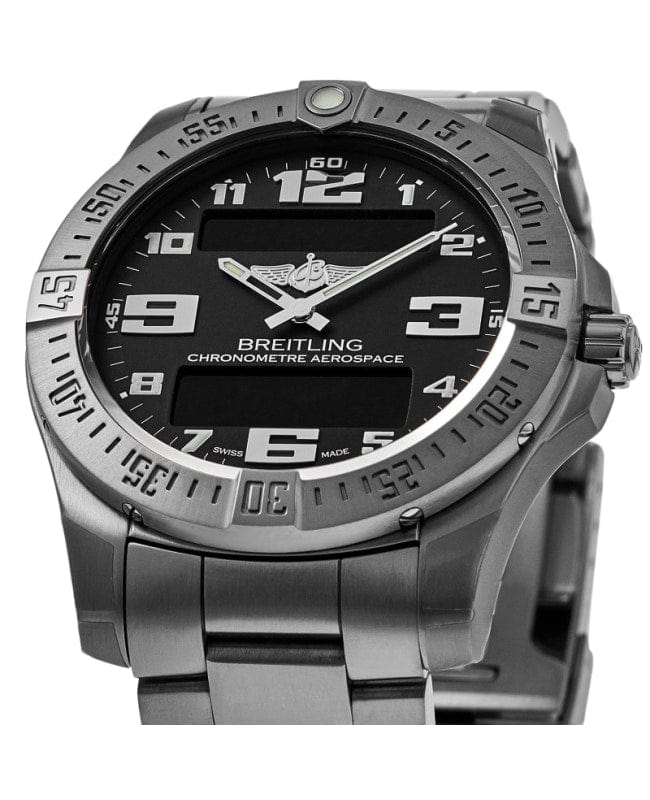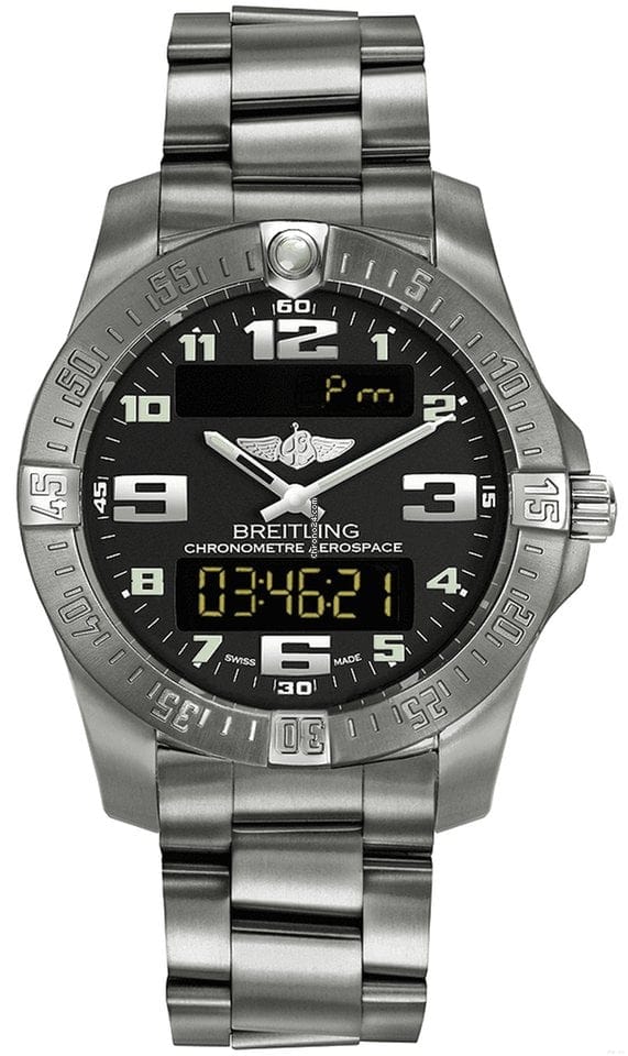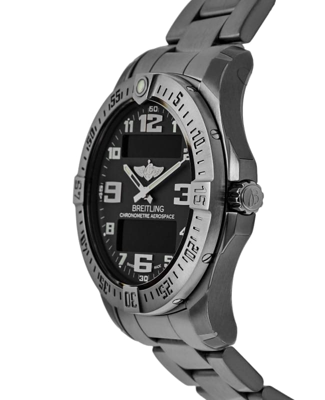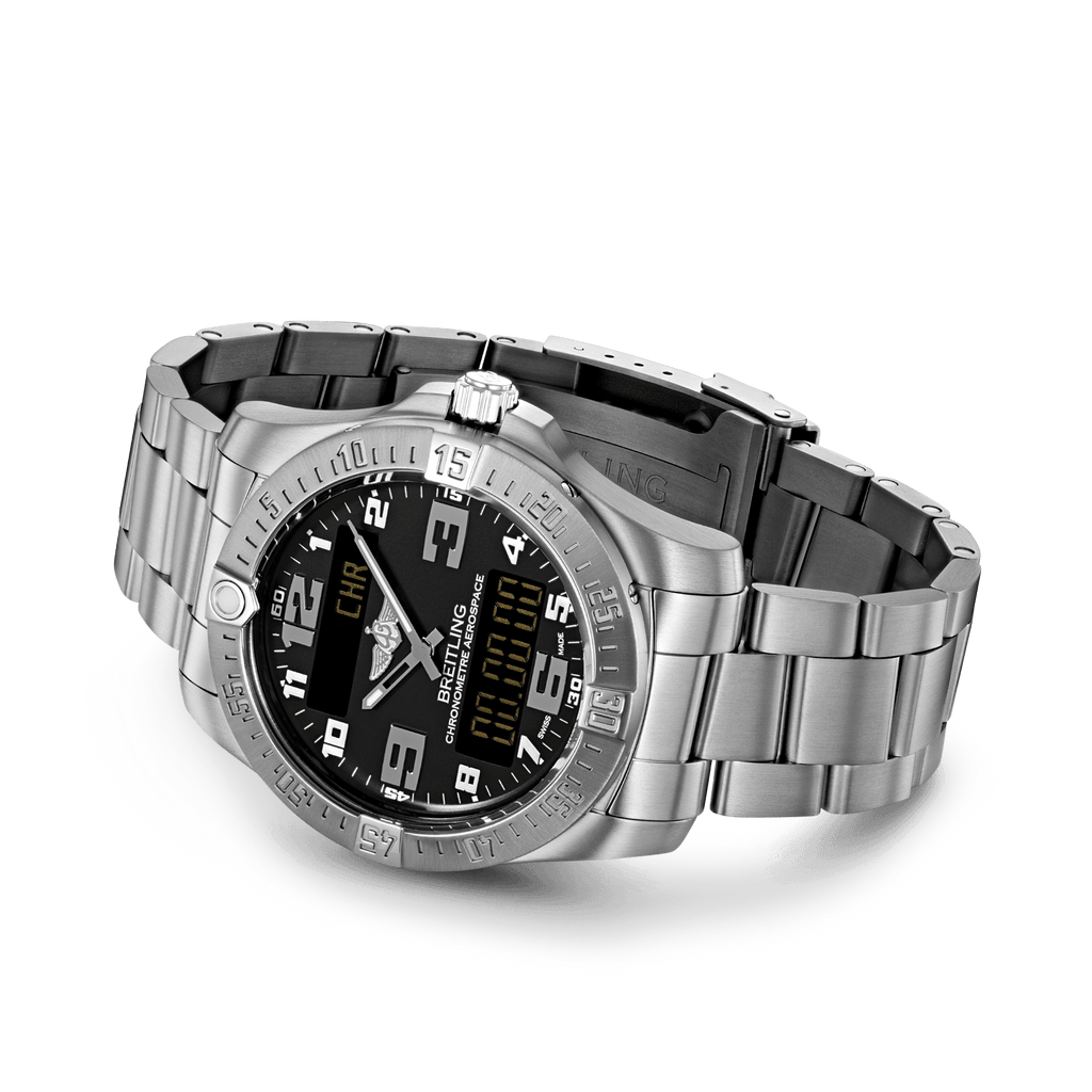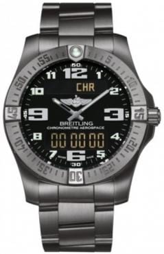 Breitling Professional Aerospace EVO. Black dial 43 mm Titanium case. Unidirectional, ratcheted Bezel Sapphire, glareproofed both sides crystal. Breitling 79 calibre, SuperQuartz™, thermocompensated quartz electronic, analog and 12/24 hr LCD digital display, display backlighting (NVG compatible), EOL indicator, 3 to 4 years power reserve. Titanium bracelet Fold clasp. Water resistance 100 m (330 ft).