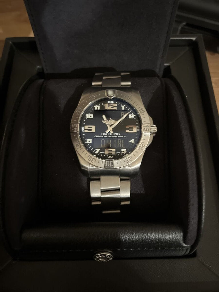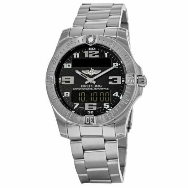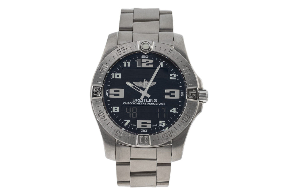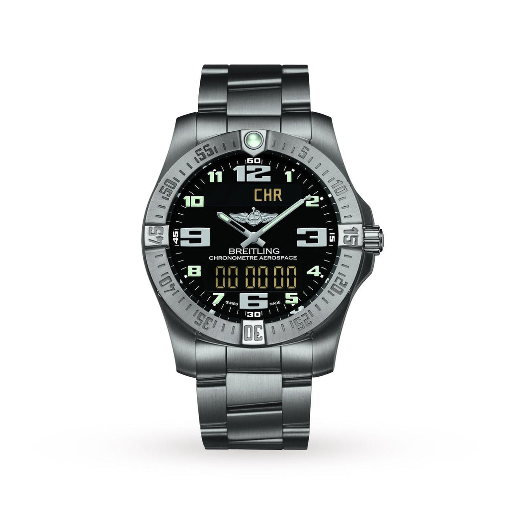 Breitling Professional Aerospace EVO. Black dial 43 mm Titanium case. Unidirectional, ratcheted Bezel Sapphire, glareproofed both sides crystal. Breitling 79 calibre, SuperQuartz™, thermocompensated quartz electronic, analog and 12/24 hr LCD digital display, display backlighting (NVG compatible), EOL indicator, 3 to 4 years power reserve. Titanium bracelet Fold clasp. Water resistance 100 m (330 ft).