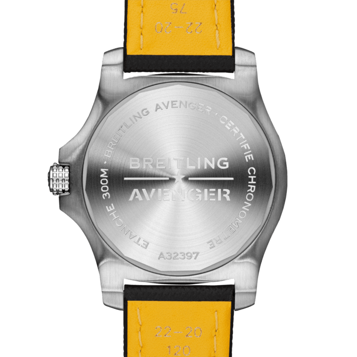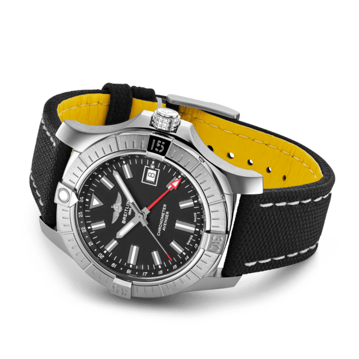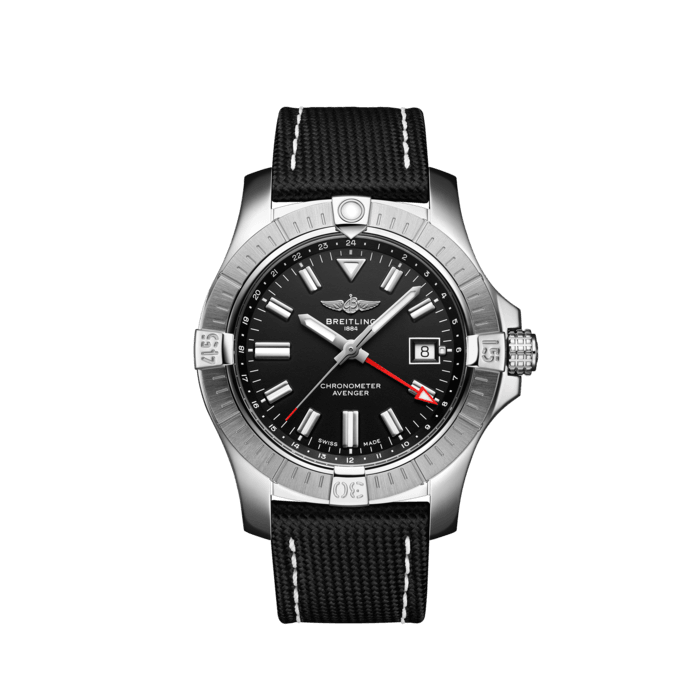 Bold, extremely robust and shock resistant, the Avenger Automatic GMT 43 features an additional red hand indicating a second time zone. As a true Breitling Avenger, it can be used wearing gloves and offers unrivalled safety and reliability to any airborne adventurer. The Avenger Automatic GMT 43 features a sturdy 43 mm stainless-steel case, black dial, and a choice of a stainless-steel bracelet or a black military leather strap that fits either a stainless-steel pin buckle or folding clasp. Thanks to its rugged bezel and its special grip pattern on the crown, the Avenger Automatic GMT 43 can be easily operated wearing gloves.