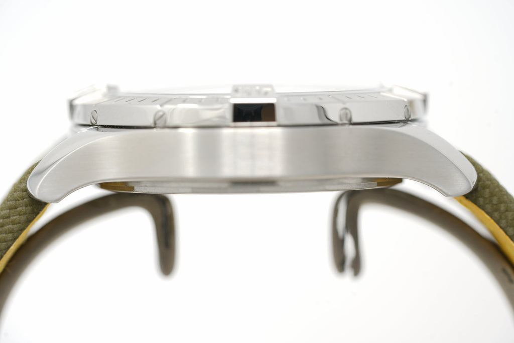 Bold, extremely robust and shock resistant, the Avenger Automatic 43 features a clean dial offering optimal legibility. As a true Breitling Avenger, it can be used wearing gloves and offers unrivalled safety and reliability to any airborne adventurer. The Avenger Automatic 43 features a sturdy 43mm stainless-steel case, colorful dial and a choice of a stainless-steel bracelet, or matching military leather strap that fits either a stainless-steel pin buckle or folding clasp. Thanks to its rugged bezel and its special grip-pattern on the crown, the Avenger Automatic 43 can be easily operated wearing gloves.