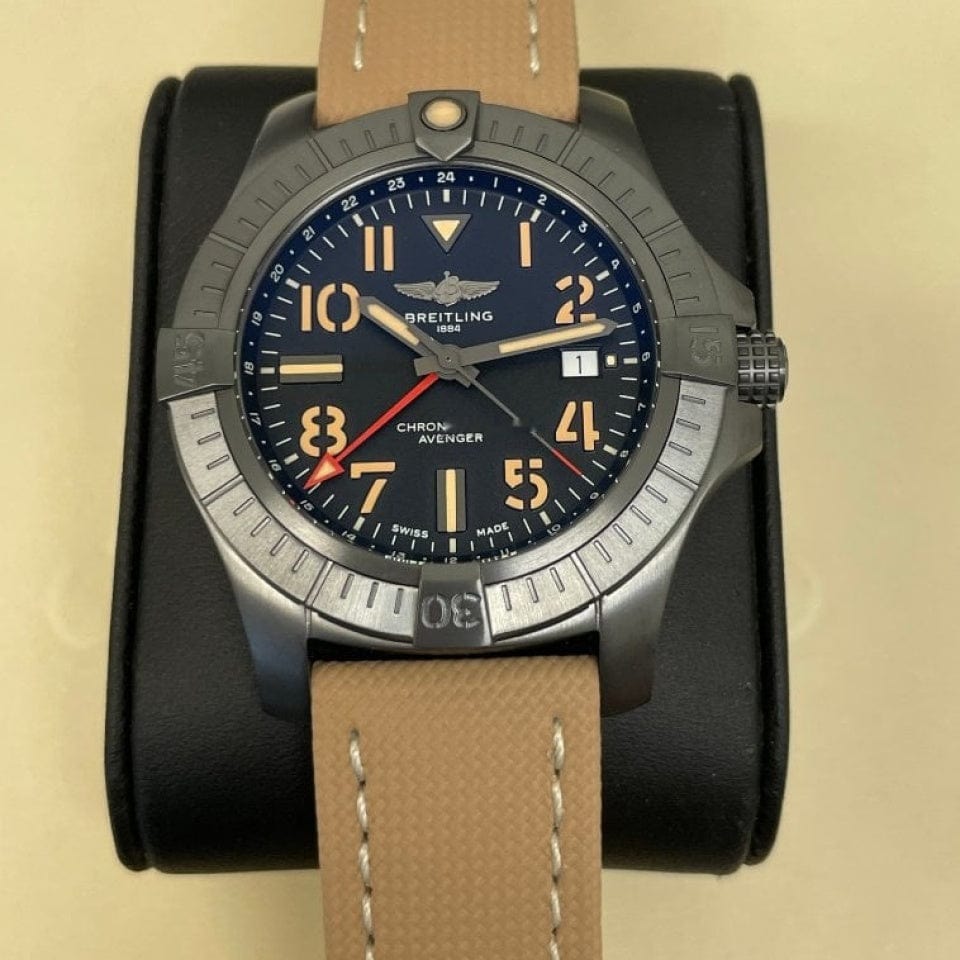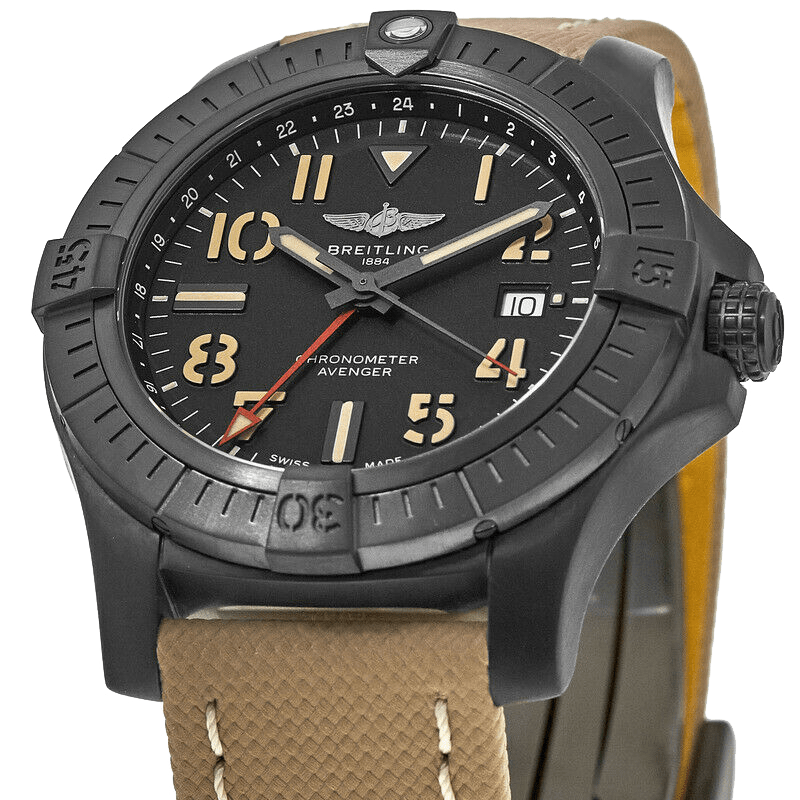 Bold, extremely robust and shock resistant, the Avenger Automatic GMT 45 Night Mission features a lightweight case and an additional red hand indicating a second time zone. As a true Breitling Avenger, it can be used wearing gloves and offers unrivalled safety and reliability to any airborne adventurer.