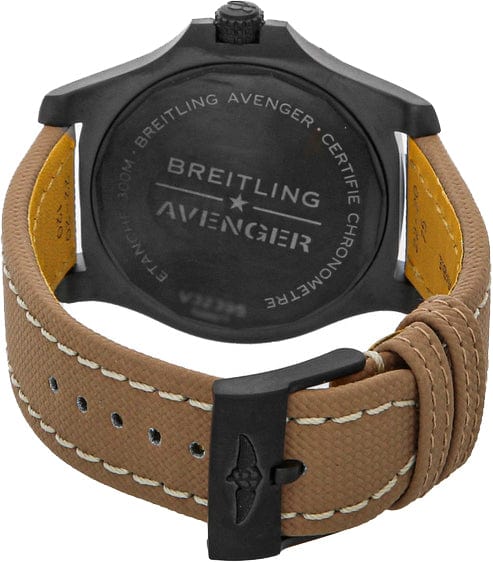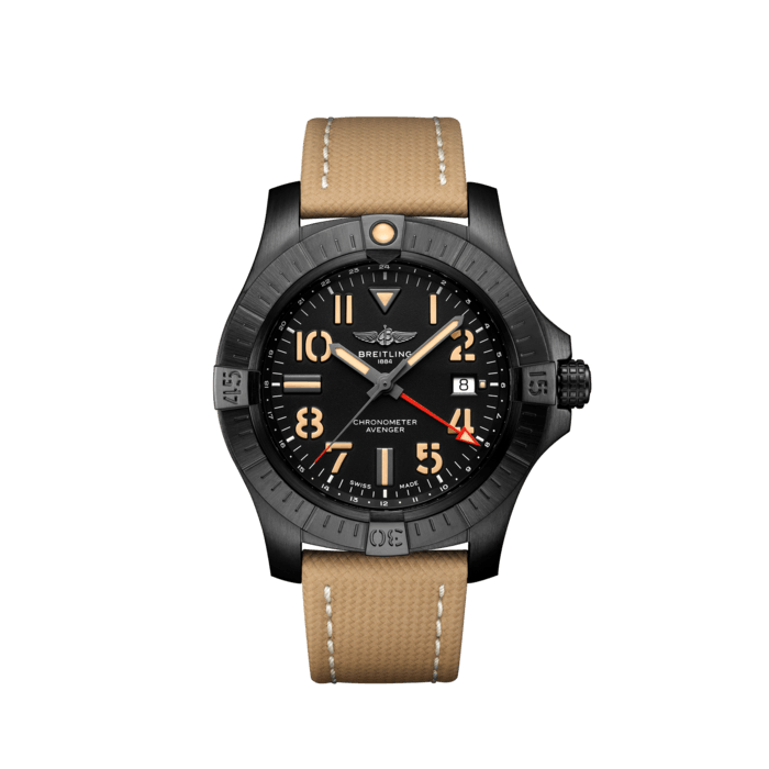 The Night Mission interpretation of the Avenger Automatic GMT 45 features a sturdy 45mm DLC-coated titanium case, black dial and a sand-colored military leather strap that fits either a DLC-coated stainless-steel pin buckle or folding clasp. Its specific Arabic numerals recall the stenciled numbers used on the decks of aircraft carriers. Thanks to its rugged bezel and its special grip-pattern on the crown, the Avenger Automatic GMT 45 Night Mission can be easily operated wearing gloves.