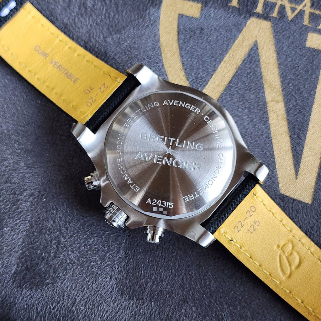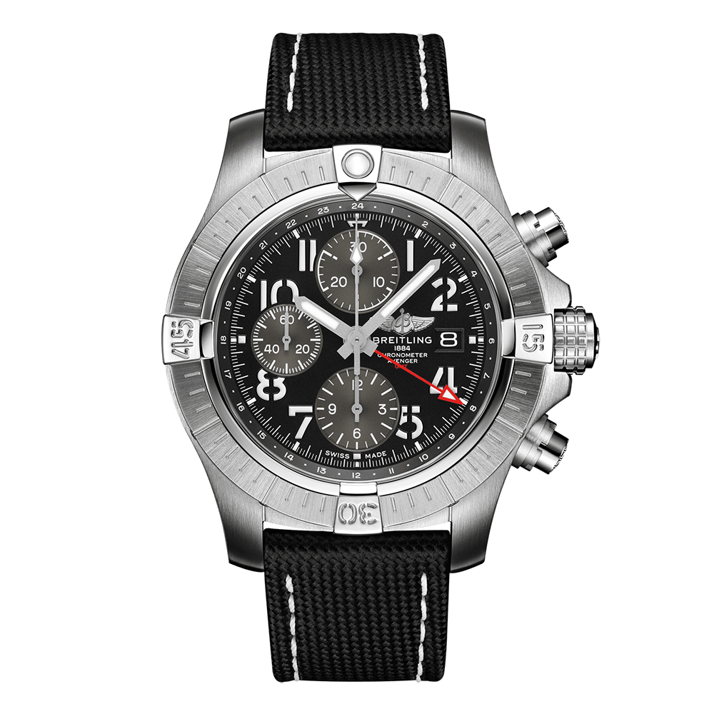 Bold, extremely robust and shock resistant, the Avenger Chronograph GMT 45 combines precision with a powerful design. As a true Breitling Avenger, it offers unrivalled safety and reliability to any airborne adventurer. The Avenger Chronograph GMT 45 features a sturdy 45mm stainless-steel case, black dial and a choice of a stainless-steel bracelet or matching military leather strap. Thanks to its rugged bezel and its special grip-pattern on the crown and chronograph pushers, the Avenger Chronograph GMT 45 can be easily operated wearing gloves.