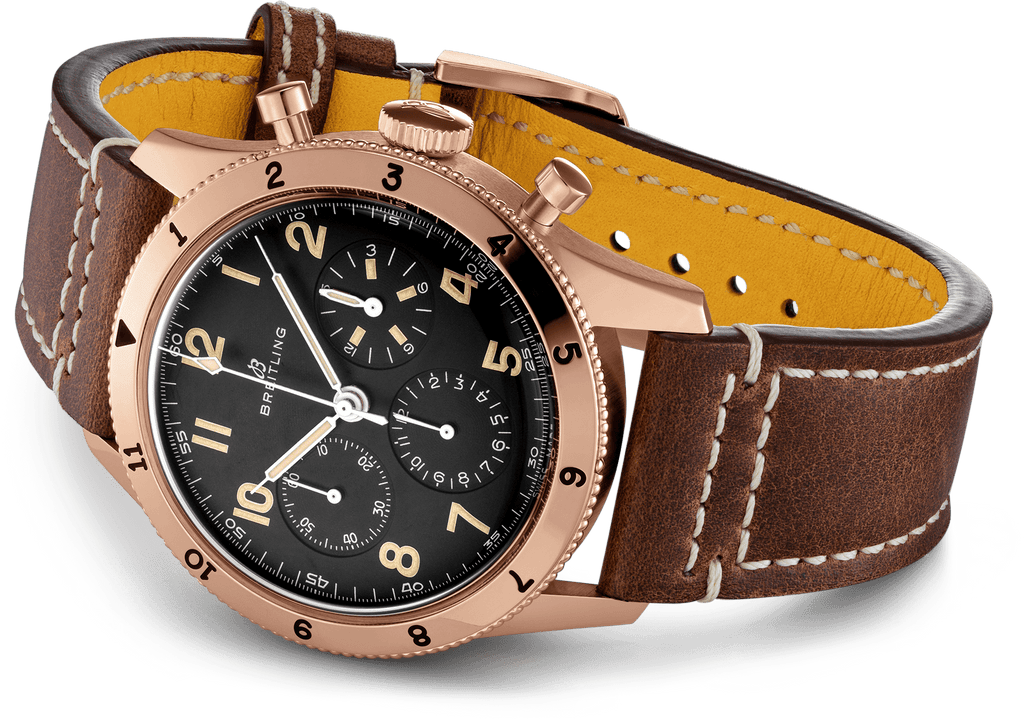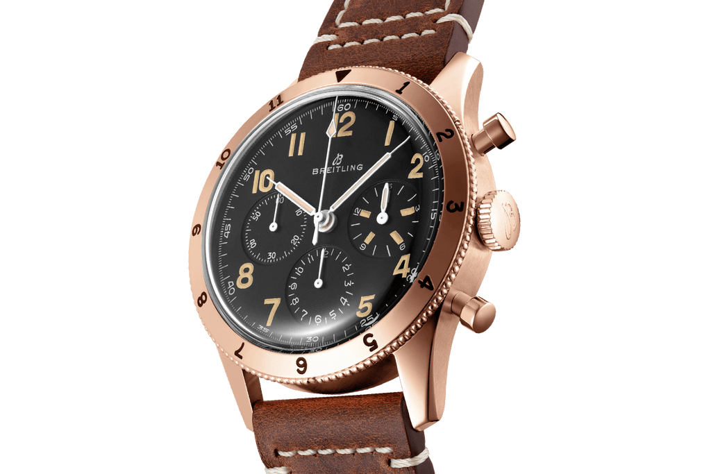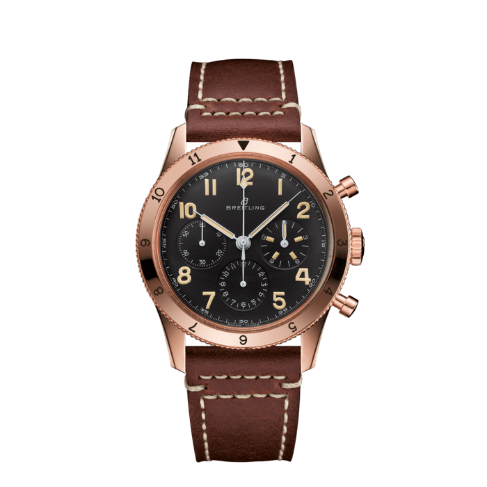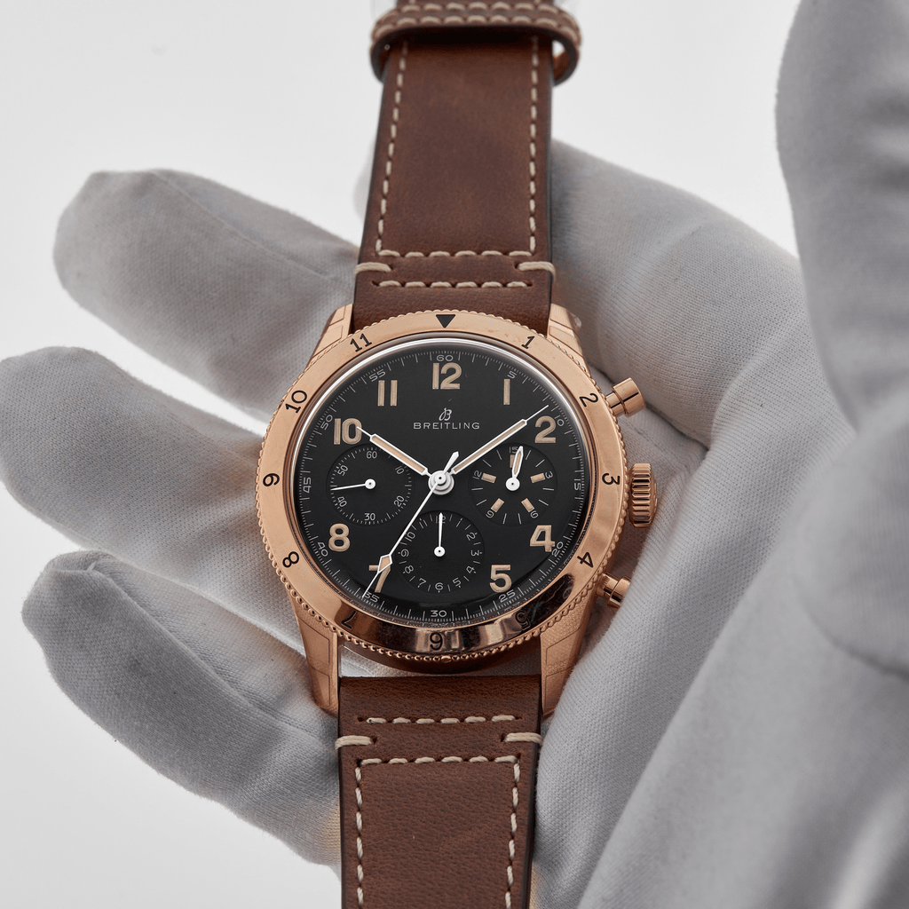 BREITLING AVI 1953 Re-Edition, Ref. RB0920131B1X1. Men's watch. Gold 18K. Automatic-Werk, Kaliber B09. Limited edition of only 253 pieces worldwide, serial no. 4347XXX. Leatherband with original pin buckle clasp in gold 18K. Very good condition, light signs of wear on case and band. Box and papers enclosed, bought 12/2021. Diameter ca. 41mm (measured without crown).