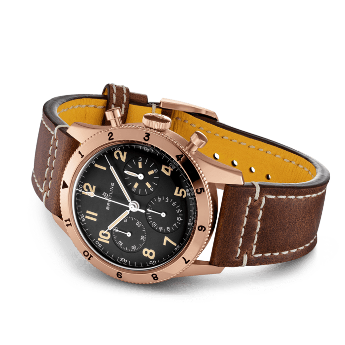 The hand-applied Super-LumiNova color has been carefully chosen to recall the original luminescent material and gives the AVI 1953 Edition an additional touch of vintage allure. The AVI 1953 Edition features a 41mm 18k red gold case with a water resistance up to 3 bar (30 meters). The AVI 1953 Edition is powered by the in-house Breitling Manufacture Caliber B09, a hand-wound COSC-certified caliber based on the renowned Breitling Caliber 01. It is available on a brown vintage-inspired leather strap with an 18k red gold pin buckle as a limited-edition of 253 pieces, each of which is engraved “ONE OF 253”.