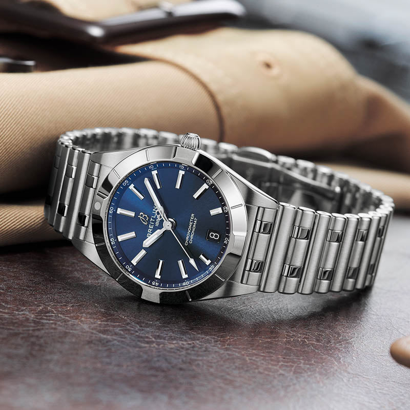 Stylish yet elegant, the modern-retro inspired Chronomat 32 is the versatile sporty and chic watch for any occasion. It is available in an array of metal cases, from cool stainless steel, to goes-with-everything bicolor, or even luxurious 18k red gold. Women craving extra sparkle will also be able to opt for diamond-set bezels, indices, and colorful dials. Featuring Breitling’s iconic and comfortable “Rouleaux” bracelet with a butterfly clasp, the Chronomat 32 is powered by the Breitling Caliber 77, a COSC-certified SuperQuartz™ chronometer.