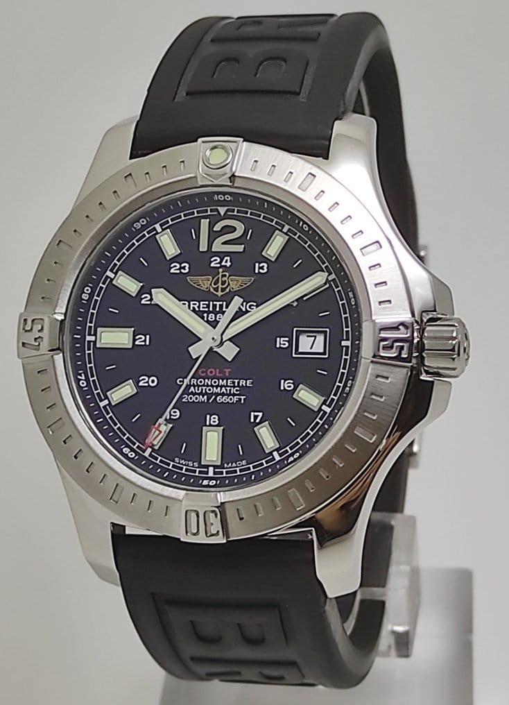 Breitling Colt Automatic 44 mm watch. Model reference: A1738811.BD44.152S.A20S.1. Steel case. Black dial. Selfwinding mechanical movement. Black rubber strap. Swiss made. Watch comes in original packaging, with set of documents and 2 years warranty.