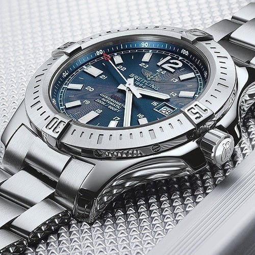 The smart, tough aesthetics of the Breitling Colt Automatic Men’s Watch perfectly demonstrate its original purpose: that of a watch designed for combat. The satin-brushed bezel features four rider tabs, and the watch gains enviable protection from the sapphire crystal glass which is glare-proofed on both sides. The blue dial is additionally enhanced by the fine circular raised motif, and complemented by a chunky stainless steel bracelet for perfect harmony and balance. The polished steel case is water-resistant to 200m and fitted with a screw-locked crown with protective reinforcements. Since 1884, Breitling have been a specialist in technical watches, and today are the official supplier to world aviation. Unusually for a large luxury watch manufacturer, all of Breitling’s watches are equipped with chronometer-certified movements. All mechanical chronograph parts are crafted in Breitling’s own workshops, and Breitling remains one of the last independent, family-run Swiss watchmakers.